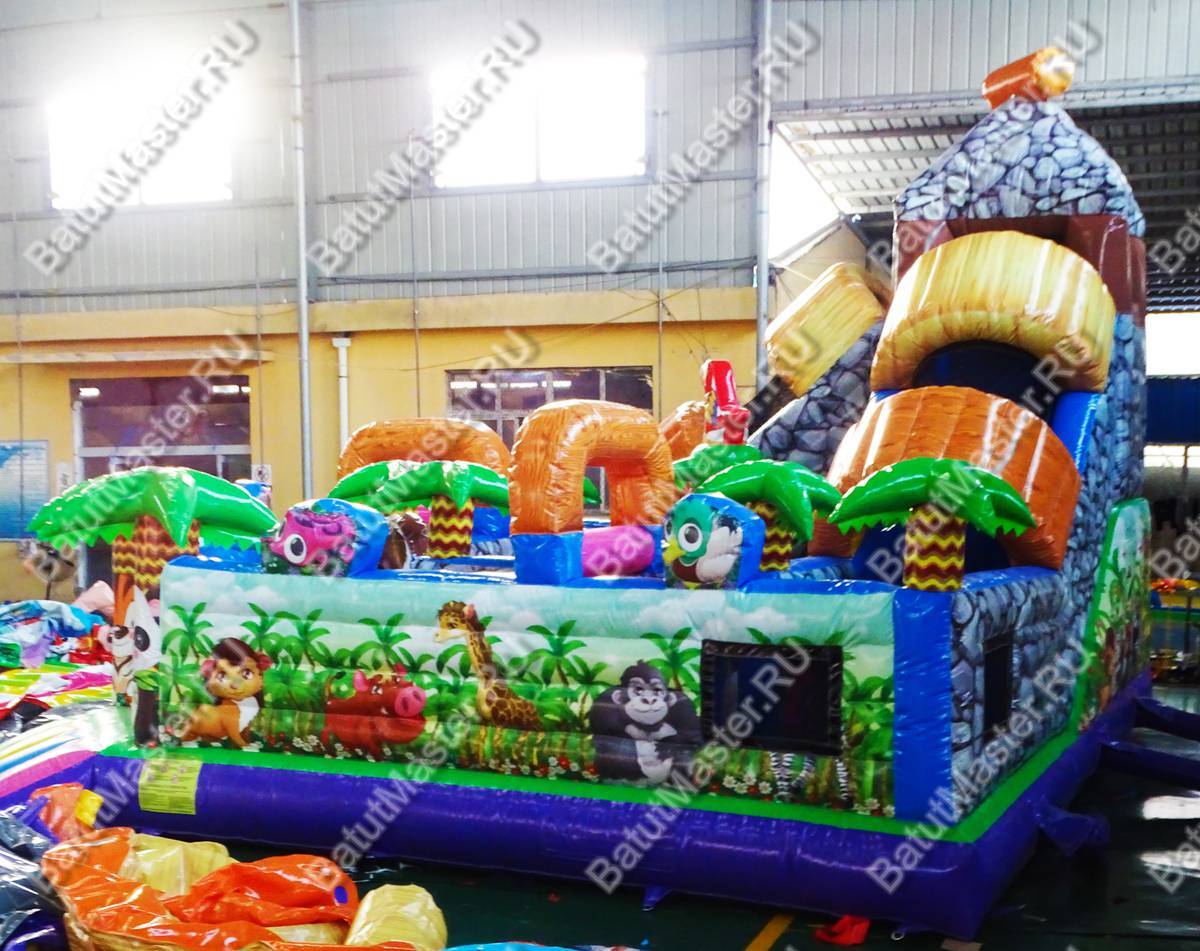 Надувной батут «В гостях у зебры» заинтересует детей разного возраста. Ему есть чем удивить. Внутри батута есть модули в виде огромных лап кошки, острые зубы динозавра, надувные фигуры попугаев, тигров и зебры. Здесь есть небольшой скалодром, горка. Дополнительным украшением батута являются надувные пальмы, разноцветный пол, а также подъем и спуск имитированы под гору из камней. Все выглядит очень реалистично и напоминает веселые джунгли.
