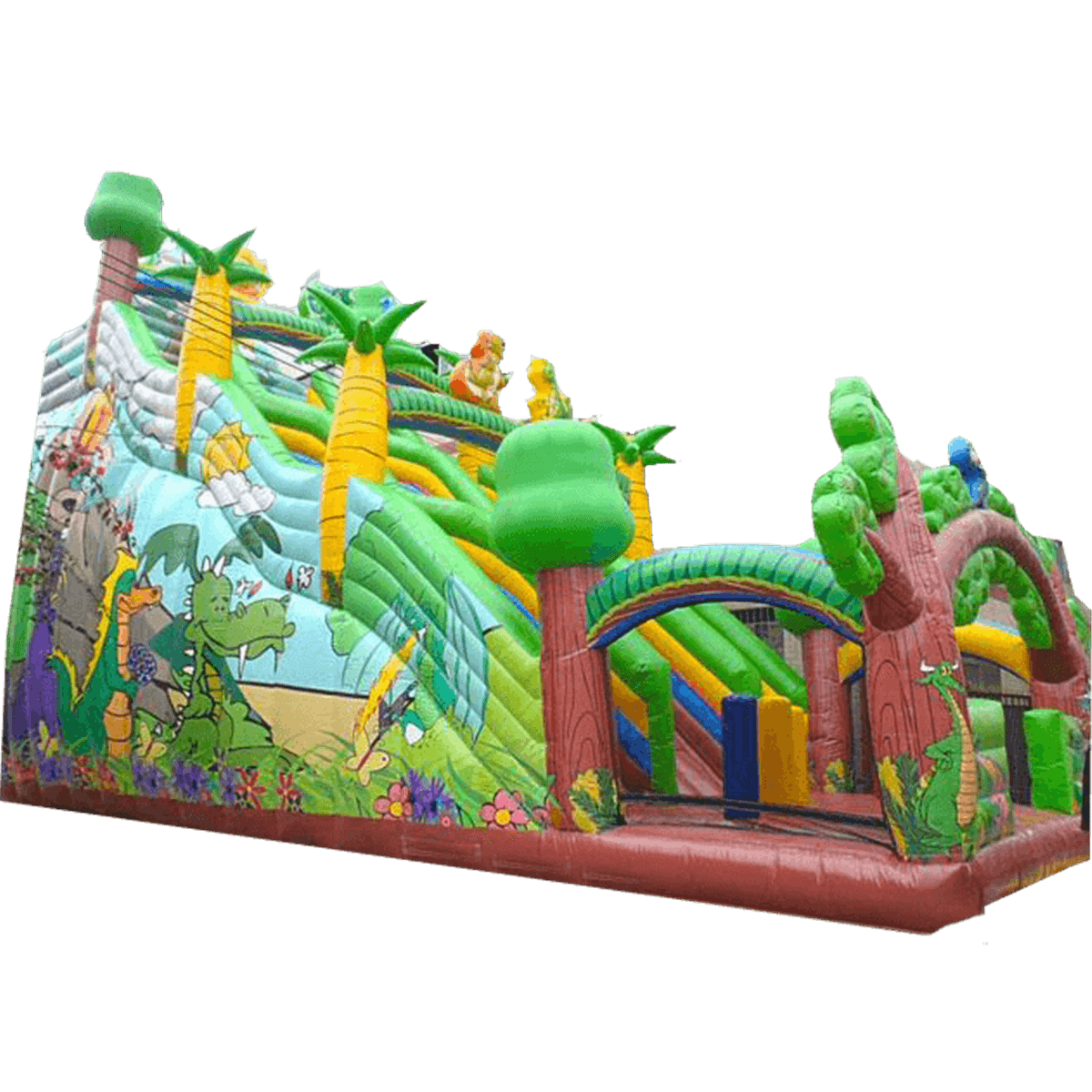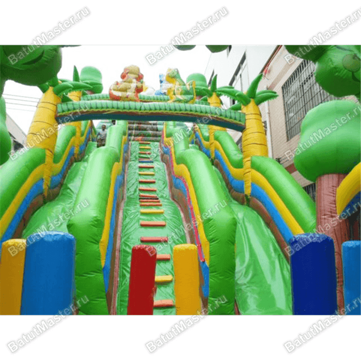 С внешней стороны многофункциональный батут разрисован забавными животными из жарких стран, а точнее, из Африки. Сам вход начинается с огромной надувной ветки, которой хватило на целую арку, дальше идет место для прыжков и для бега тоже коричневым цветом. Самой главной достопримечательностью батута является высокий подъем, на самой вершине расходящийся на 2 части – правую и левую горки. Конечно, он не может впечатлять своей длиной и насыщенностью зеленого цвета.