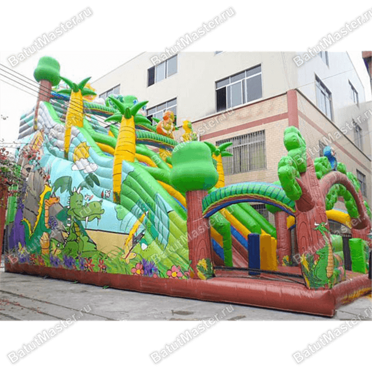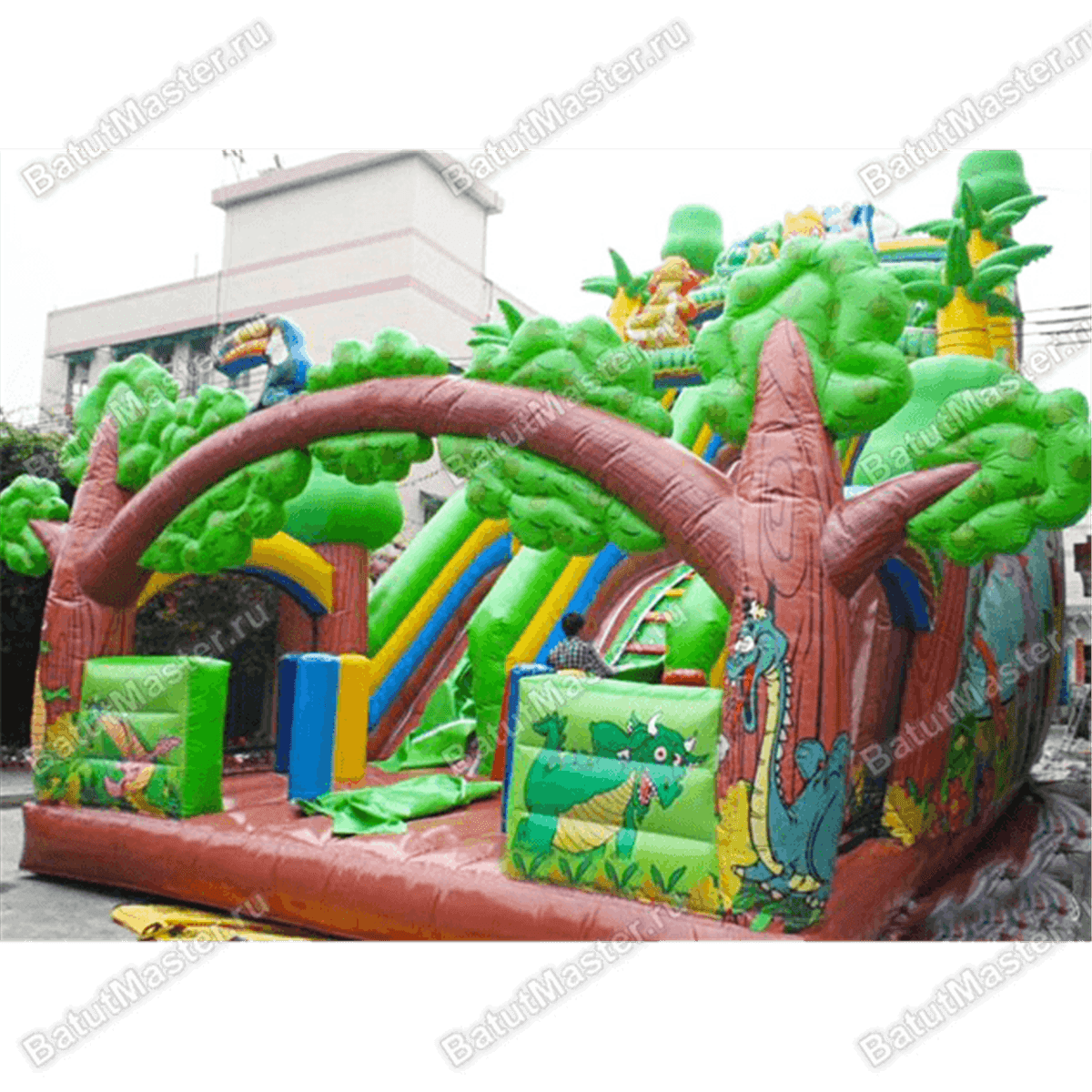 Огромный и яркий батут с множеством игровых фигур выглядит, как настоящие заросли джунглей с натуральной зеленью, веселыми спусками и животными. В его цветовой гамме преобладают ярко-зеленый и коричневый древесный цвет. Сама конструкция очень высокая, не сомневайтесь, что ее будет видно очень далеко – проблем с посетителями у вас точно не будет.