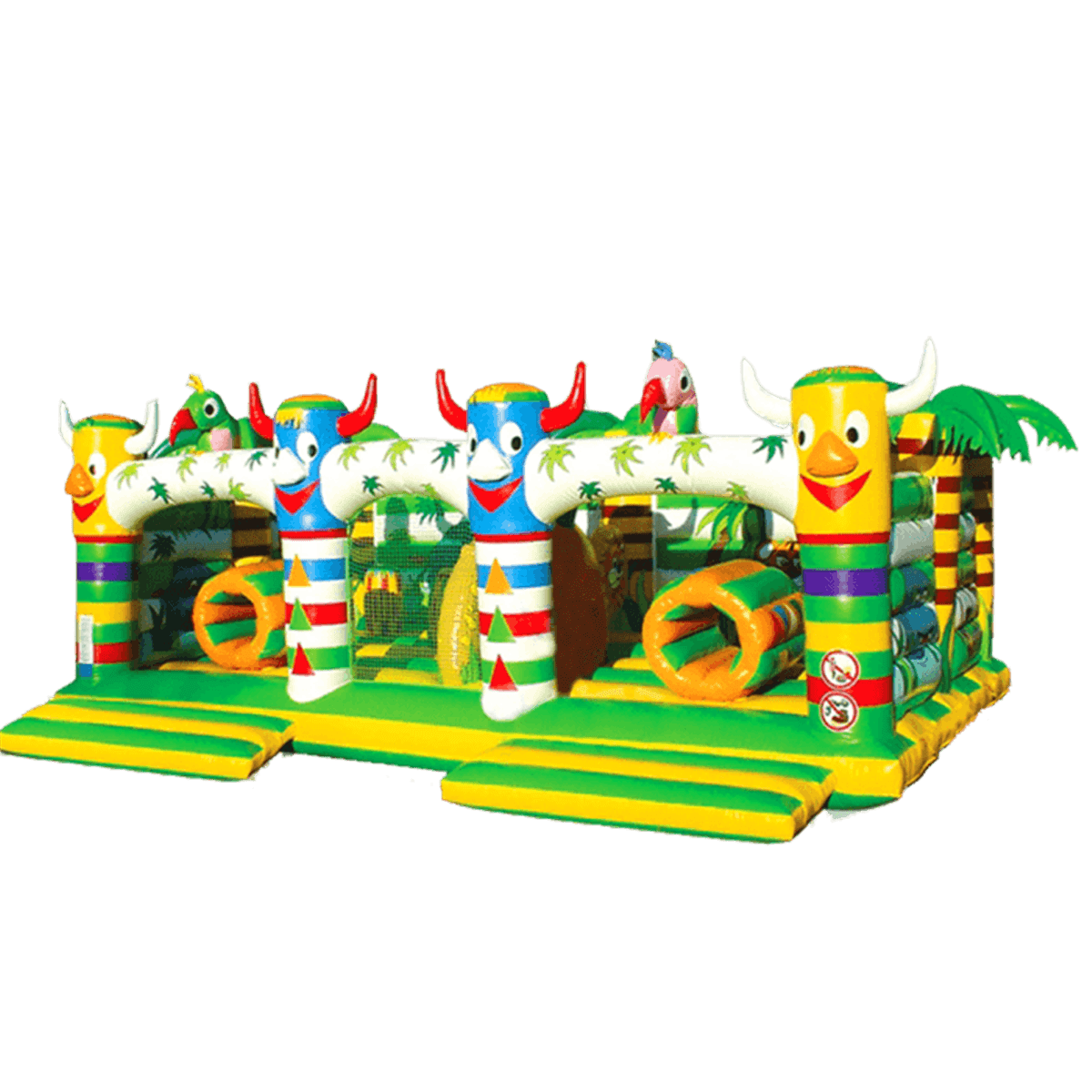 Аттракцион небольших размеров имеет полосатую расцветку и напоминает настоящий лабиринт, так как территория заставлена высокими колоннами в виде языческих божеств, между которыми еще и установлены тоннели в виде барабанов. Яркий батут преимущественно из желто-зеленого ПВХ, но в нем также присутствуют и другие цвета, просто указанная окраска характерна для нижнего основания. Верхняя часть маленького батута забавно украшена яркими попугаями и пальмовой растительностью. Небольшие барабаны, через которые можно пролезть, пошиты из оранжево-зеленого ПВХ.