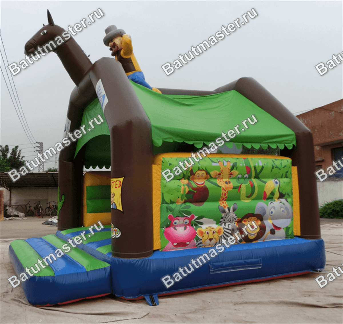 Внутри яркий батут пошит из трехцветных полос поливинилхлорида: желтые, синие и зеленые. Внешние стороны украшены рисунками в виде изображения самых разных животных. Перед самым входом установлена широкая, на всю длину аттракциона, мягкая надувная подушка из синего и зеленого ПВХ, как и внутренняя основная площадка внизу. Аттракцион подойдет для выездных мероприятий на природе, сдувается и надувается конструкция всего лишь за пару минут.