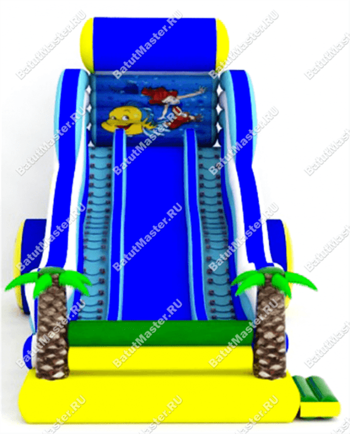 Высоту спуска поддерживает сзади желто-синий надувной цилиндр, который накачивается воздухом отдельно от основной конструкции. Общая цветовая расцветка из голубого и желтого ПВХ напоминает картинку песчаного пляжа и близ расположенного водоема, поэтому поверхность спуска не ровная, а волнистая, передающая настроение бушующего моря.