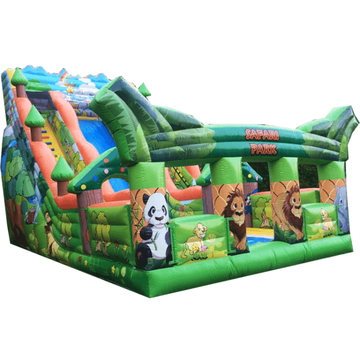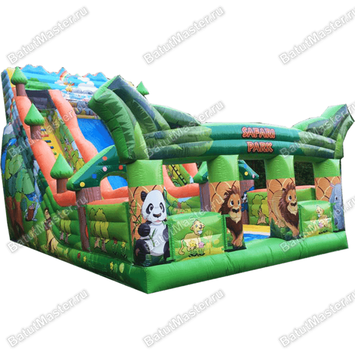 Огромный, красочный и интересный аттракцион просто завораживает внимание даже взрослых своими персонажами. Все они родом из жарких стран, а, точнее, из африканских лесов-джунглей. Батут обязательно будет заметен издалека, так как высокая и яркая горка выступает вверх на 8 м. конструкция многофункциональная, здесь и место для прыжков и для бега достаточно просторных размеров и горка достигает приличной ширины.