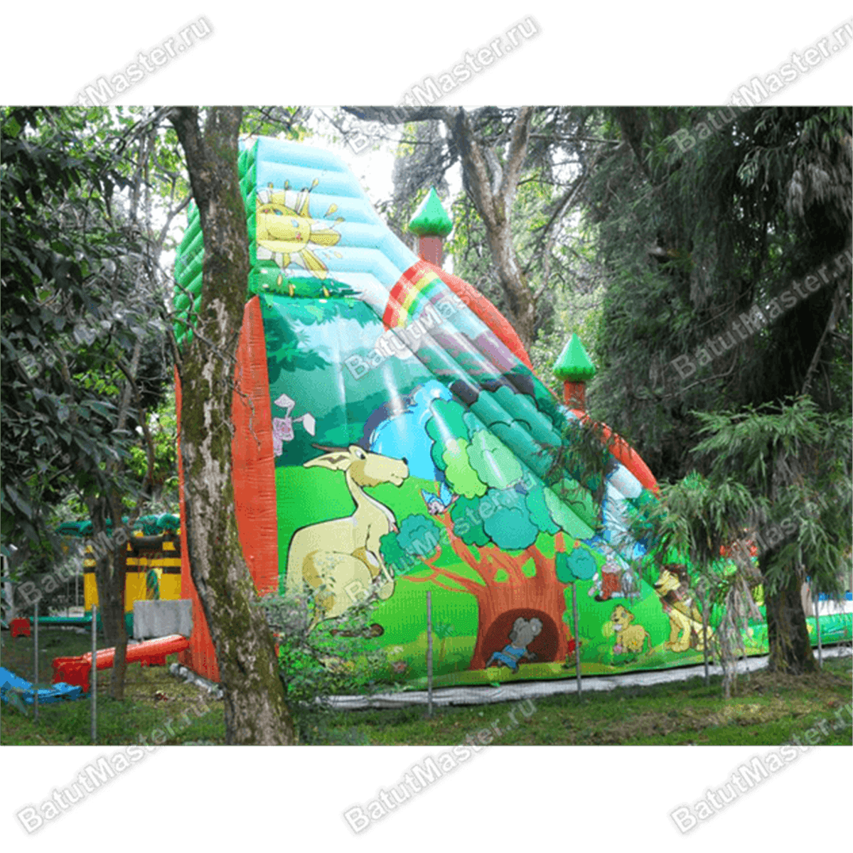 Уже на самом входе посетителей будут ждать большие львы и львята, панды. После территории для игр начинается два подъема на горку желтого цвета с разноцветными ступеньками, но большая часть отводится средней зоне между ними – высокой и крутой горке синего цвета. На самой вершине установлена небольшая стенка ПВХ с изображением радуги и забавных животных. С внешней стороны аттракцион полностью передает лесную природу со всевозможными лиственными кронами, цветами и пенечками. Небольшие пирамидальные деревья установлены по боковым бордюрам ПВХ, они еще раз подчеркивают то, что батут находится именно в лесной чаще.