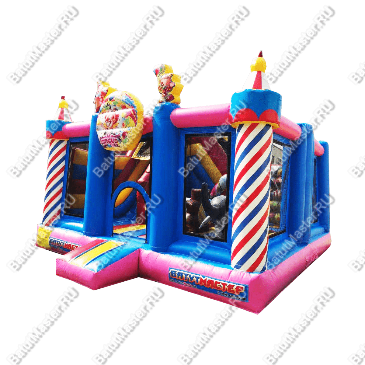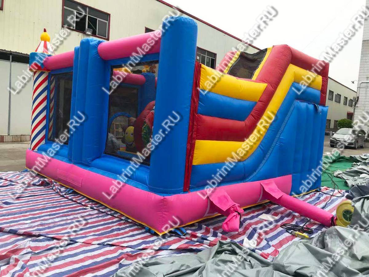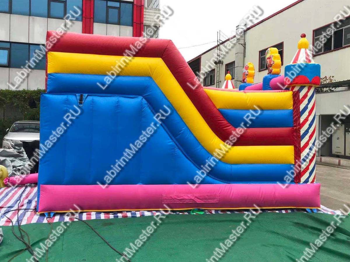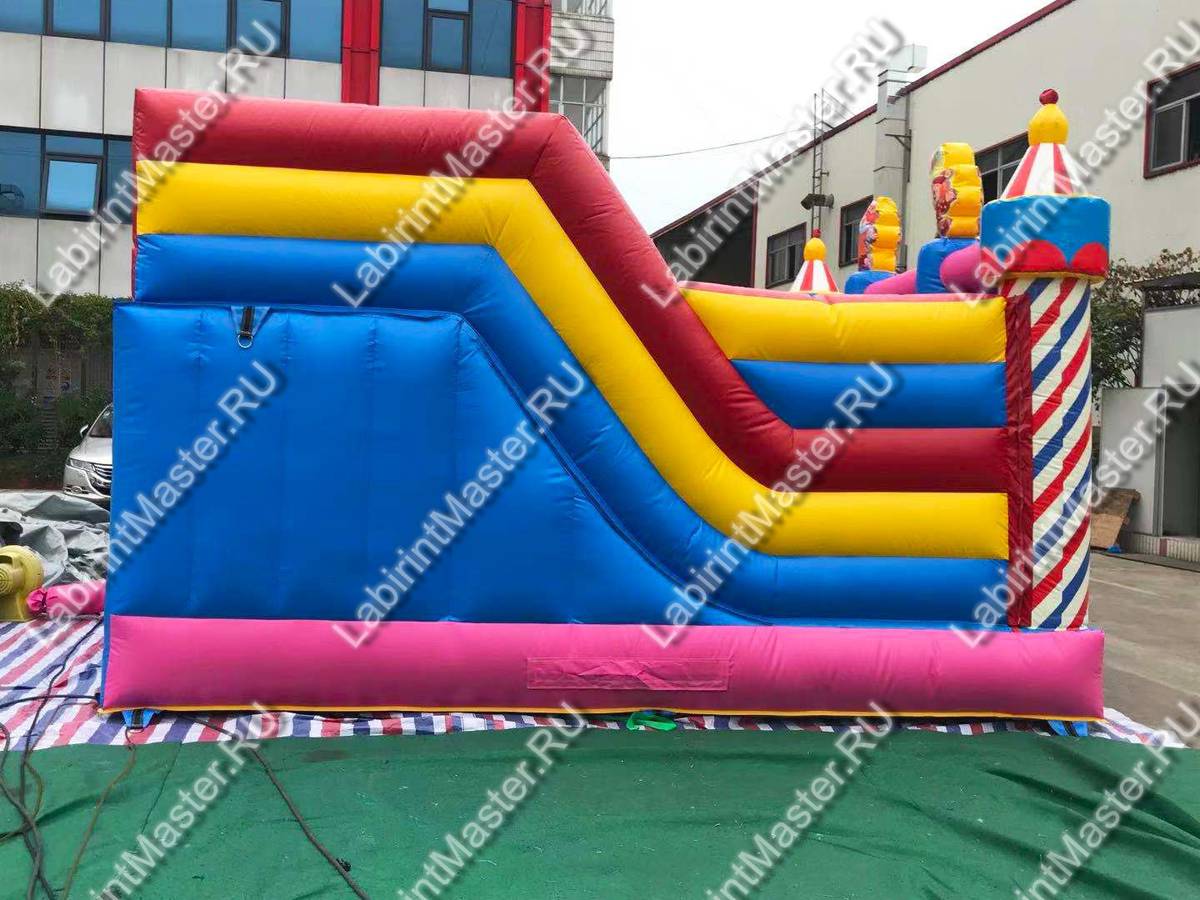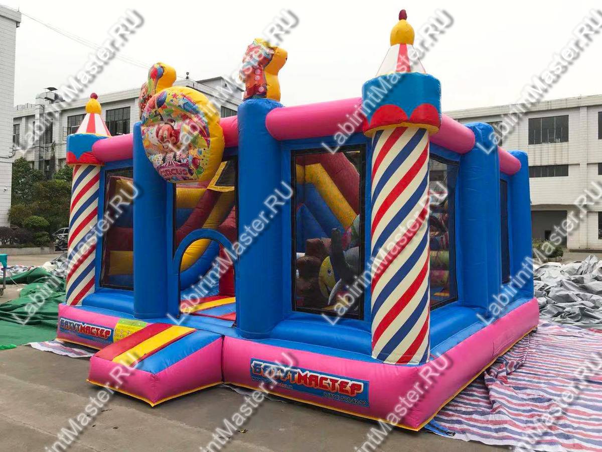 Надувной батут «Яркий цирк» уже на фасаде украшен яркими надувными элементами в виде сладостей, а вверху центра фасадной стенки оборудован баннер с изображением клоуна и фейерверка. Сам же батут имеет интересную конструкцию и за исключением задней стенки состоит полностью из сетки. Входной проем находится внутри фасада, между синими надувными колоннами и имеет форму арки.