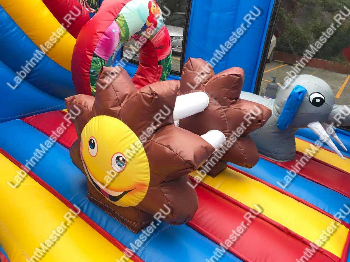 Основная площадка-основание батута имеет квадратную форму с длиной одной стороны 5 м. Высота комплекса 3 м. Пройдя через входной проем, дети попадают на просторную прыгательную площадку с надувным слоном, солнышком и лазом в виде попугая. И на всем этом можно с удовольствием попрыгать.