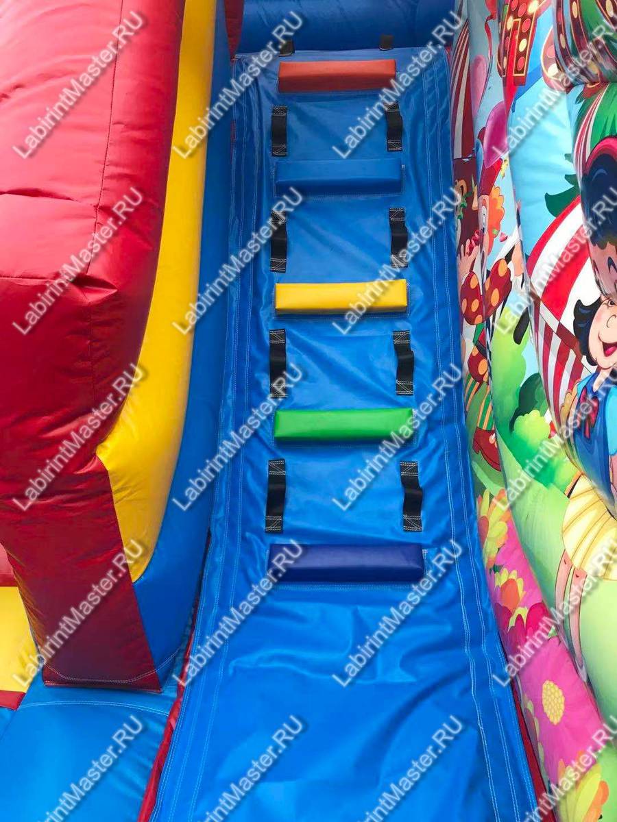 Но самое интересное «спрятано» в дальнем левом углу – это горка. Чтобы попасть на нее, придется преодолеть высоту стартовой площадки в 2 м с правой стороны от спуска. Боковые стороны горки нарушают структуру коммерческого аттракциона из сетки и образуют сплошной надувной угол и заднюю стенку из ПВХ. Внутри батут для бизнеса украшен большим изображением, демонстрирующим жизнь цирка и его представления.