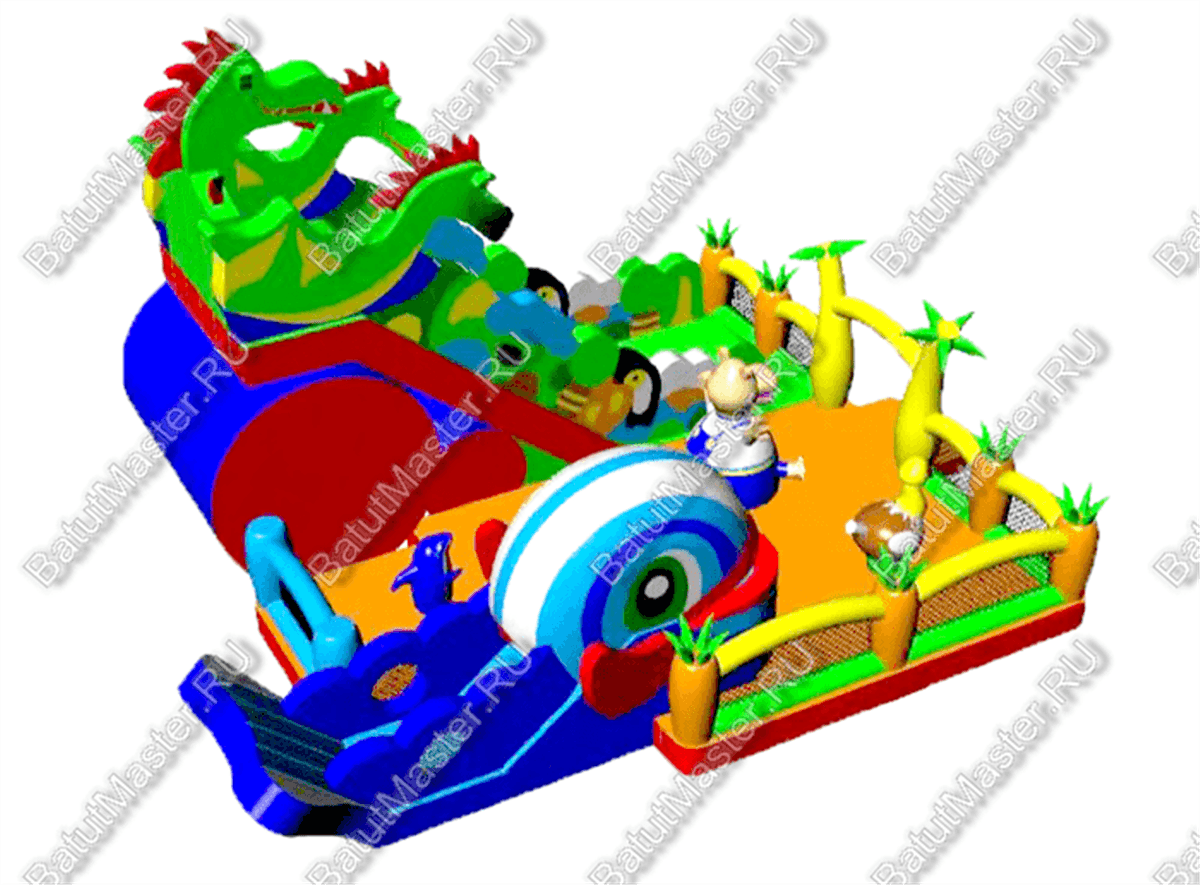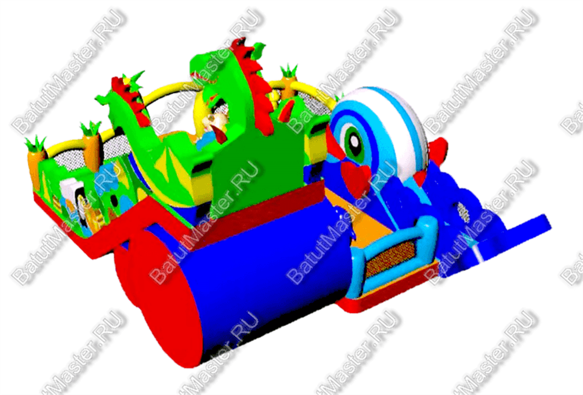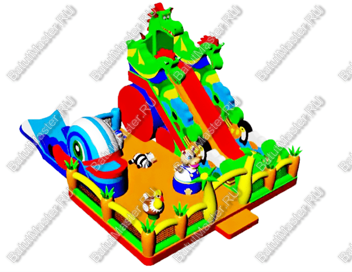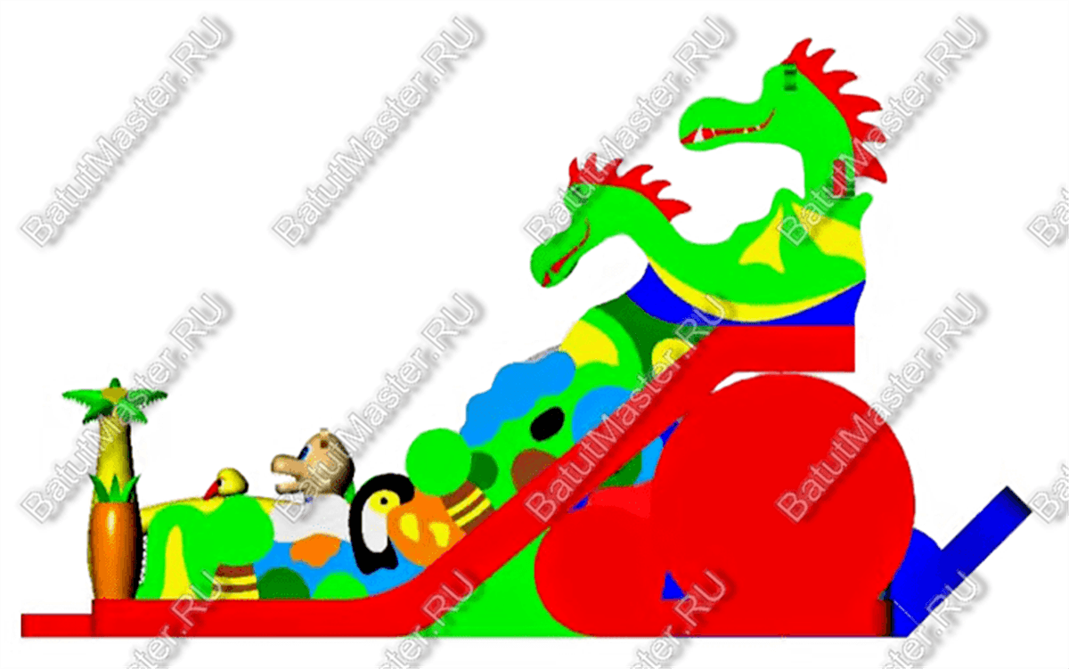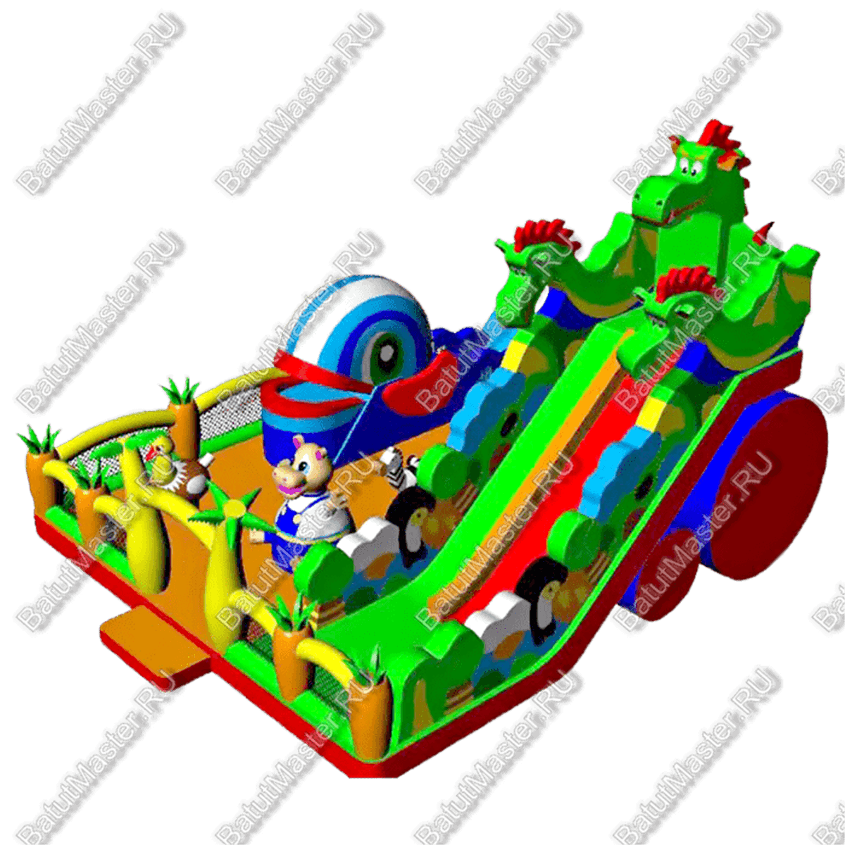 Ярким украшением батута являются головы змея. Одна возвышается посередине, а две других вдоль боковых бортов. Не только яркой окраской материала привлекателен данный комплекс. Здесь имеется надувная горка с волновым типом спуска. Чтобы подняться на ее вершину нужно преодолеть множество мягких разноцветных ступеней. Высокие бортики горки устойчивы и предотвращают от выпадения. Надувные бегемот и зебра – этих героев так любят дети и испытают радость при встрече с ними.