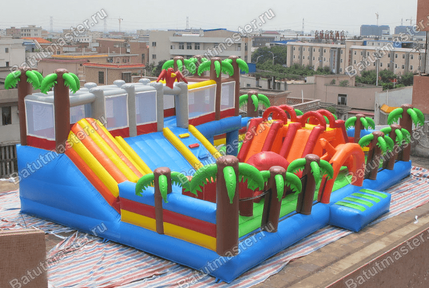 Коммерческий батут таких достойных размеров и с такой насыщенностью игровых фигур может заменить любой современный аквапарк, стать отдельной зоной отдыха и развлечений на открытой местности. Основная часть ограждения по периметру – это ряд из пальм, которые соединены между собой нейлоновой прозрачной сеткой. Как только ребенок зайдет внутрь яркого батута, он познакомится с двумя огромными фигурами доисторических животных – динозавров. Дальше перед ним откроется путь к двухэтажному небольшому комплексу, где второй этаж – это закрытая площадка для прыжков, ведущая горками и туннелями вниз на первый.
