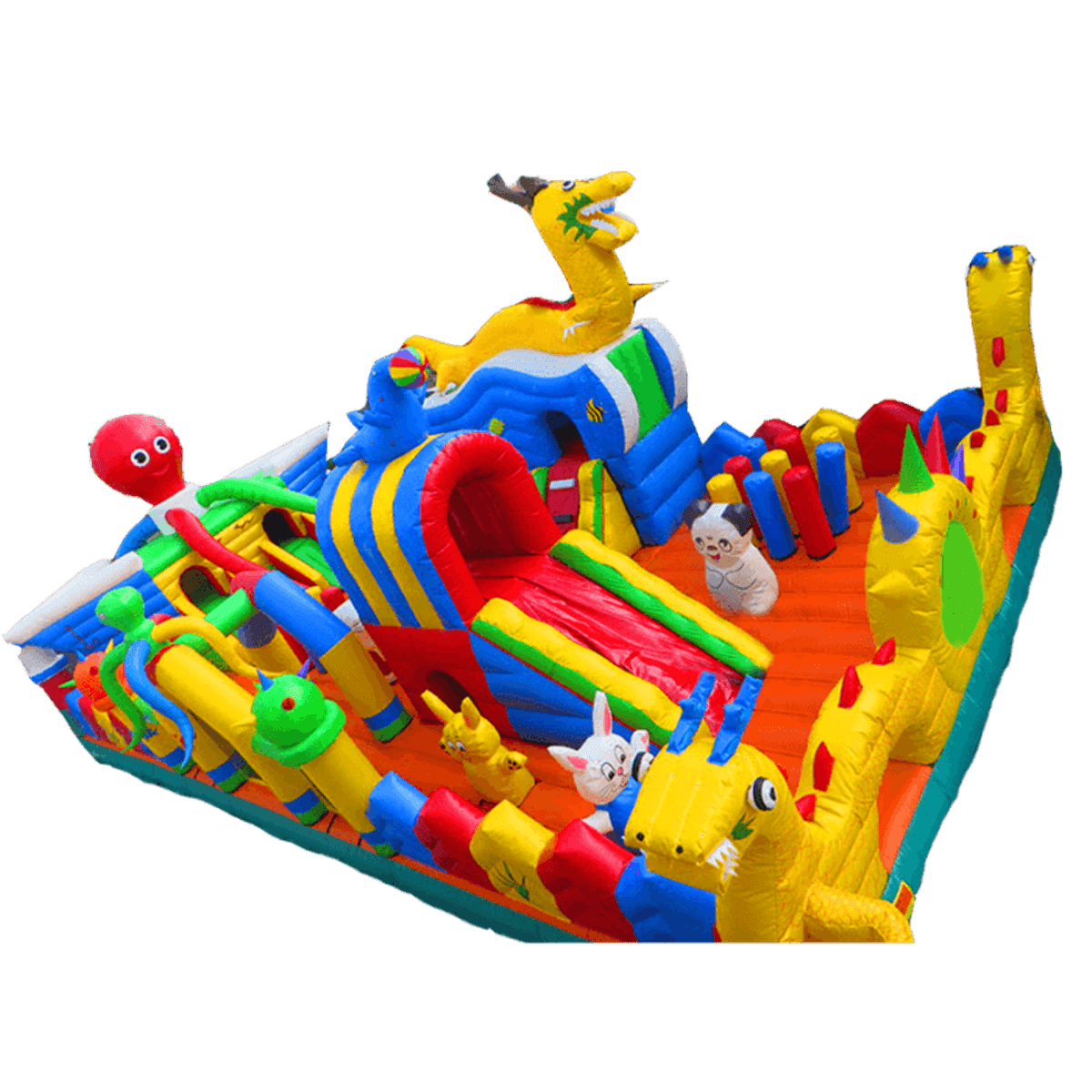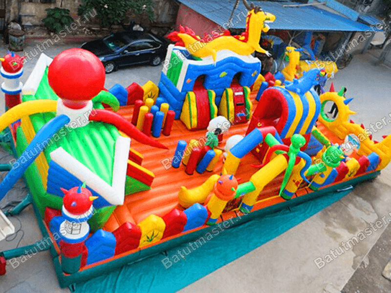 Фасадная сторона выглядит в качестве трех желтых арок с разноцветными шипами по верху, где одна из них и есть вход. Дальше начинается небольшая горка, но и внутри нее можно отыскать туннель. Со всех сторон от этого модуля установлены фигуры самых разных животных и просто комплекс надувных цветных столбиков. На правой и задней части яркого батута имеются подъемы-горки, верх одного из них украшен желтым осьминогом, а на втором разместился привлекательный дракон желтого цвета. По углам расставлены высокие столбы, верх которых украшают разноцветные булавы.