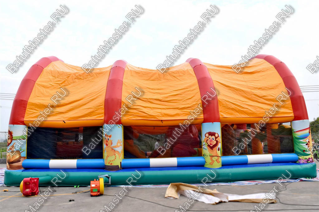 Фигуры животных из ПВХ мы можем увидеть еще на входе, проходя внутрь батута, их количество только увеличивается, но здесь можно встретить и другие увлекательные игровые препятствия в виде цветных столбиков, скалодромов и невысоких горок. Заканчивается путешествие высокой горкой из двух склизов, которая по ширине занимает все пространство аттракциона.
