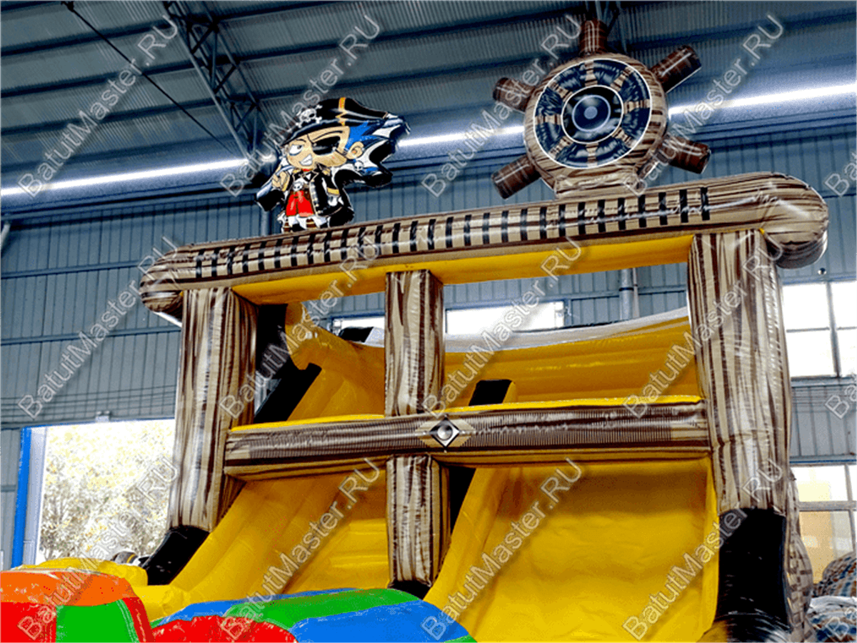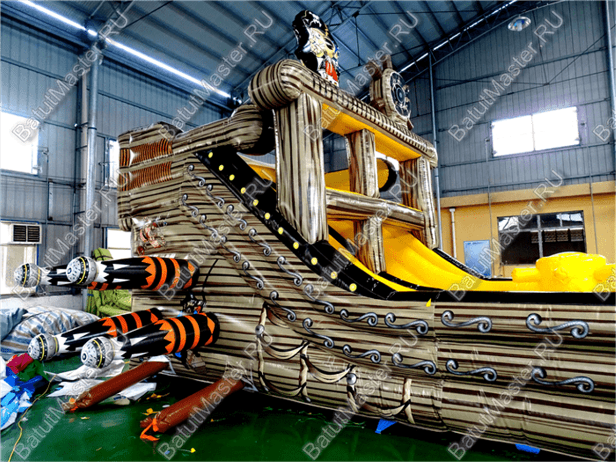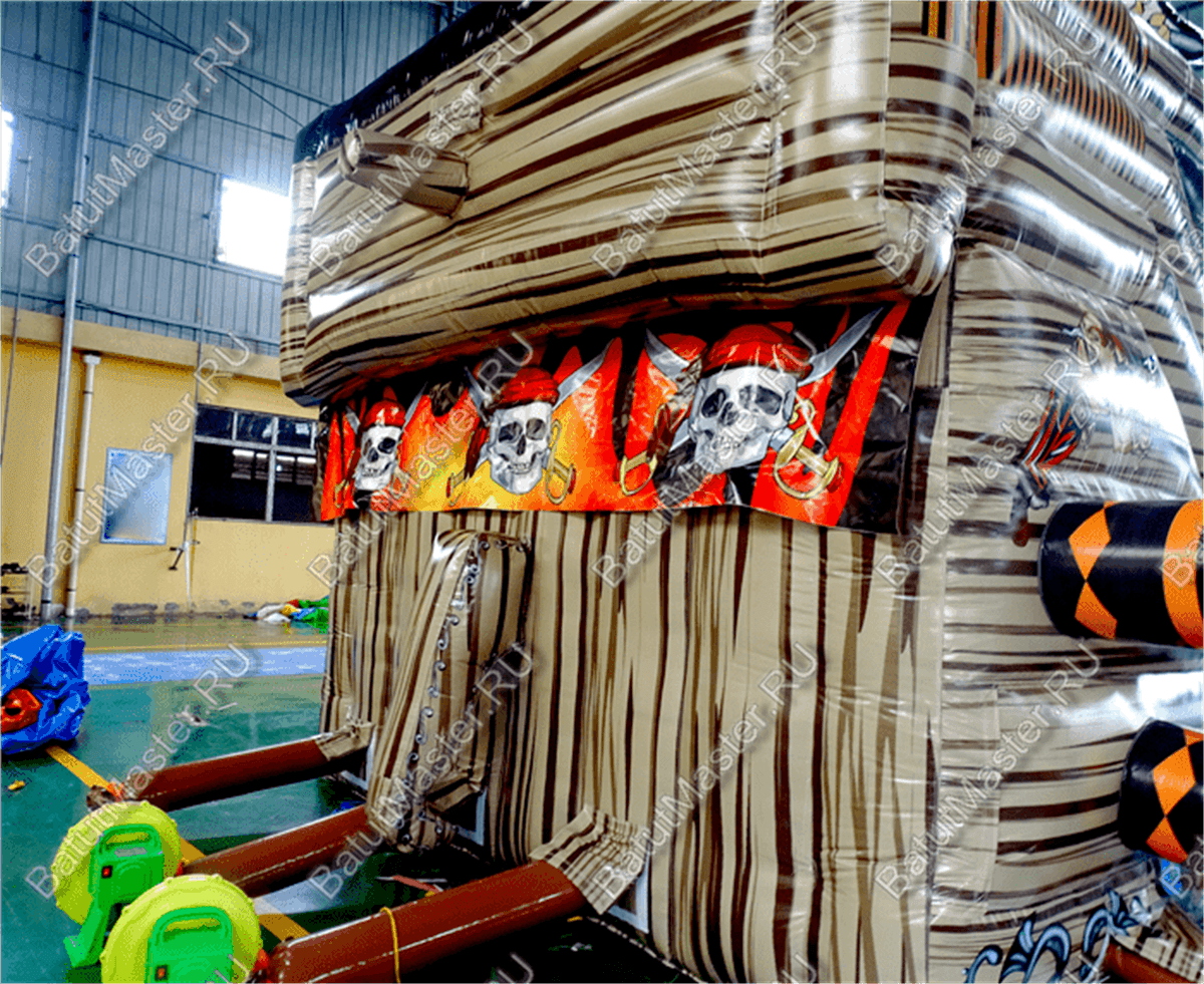 Вход на корабль осуществляется через арку, рядом с которой по обе стороны расположены красочные надувные пушки. Первое, что бросается в глаза при входе, - это красно-белый флаг с черепом посреди. Внутри батут сделан в другой цветовой гамме: преобладает жёлтый цвет, также есть красный, синий, зелёный. Наверху сидит грозный пират рядом со своим штурвалом.