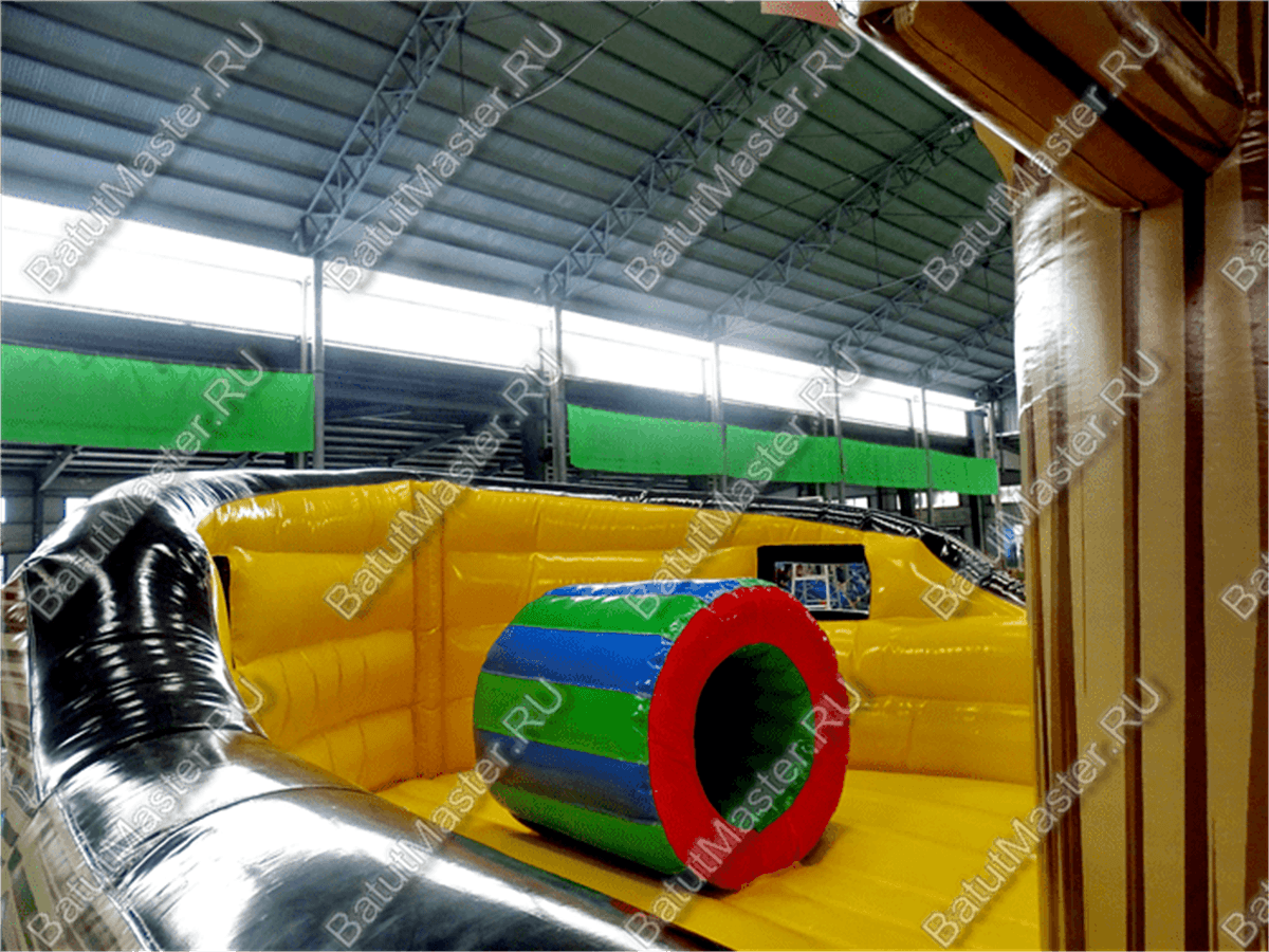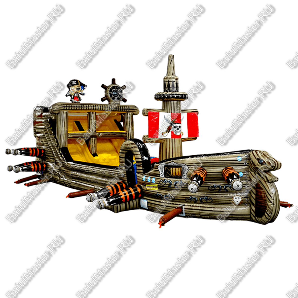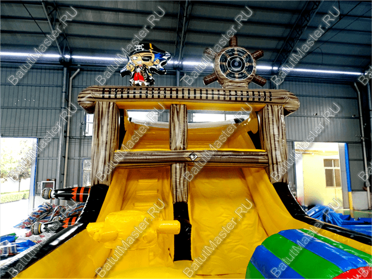Вход на корабль осуществляется через арку, рядом с которой по обе стороны расположены красочные надувные пушки. Первое, что бросается в глаза при входе, - это красно-белый флаг с черепом посреди. Внутри батут сделан в другой цветовой гамме: преобладает жёлтый цвет, также есть красный, синий, зелёный. Наверху сидит грозный пират рядом со своим штурвалом.