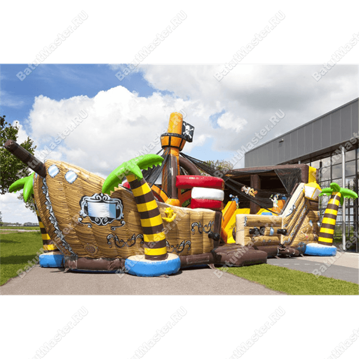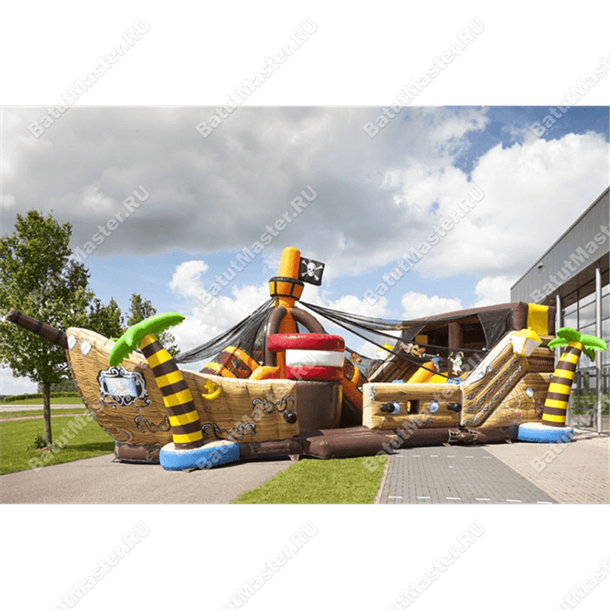 Это не простой пиратский корабль, а боевой! Уже в самом начале на пороге для стрельбы установлены серые надувные пушки, поэтому этот коммерческий батут может показаться достаточно увлекательным даже для взрослых. Интересная яркая окраска делает его заметным даже издалека, а по центру стоит высокая красная мачта с надувным флагом такого же цвета, на котором изображен герб всех пиратов – череп.