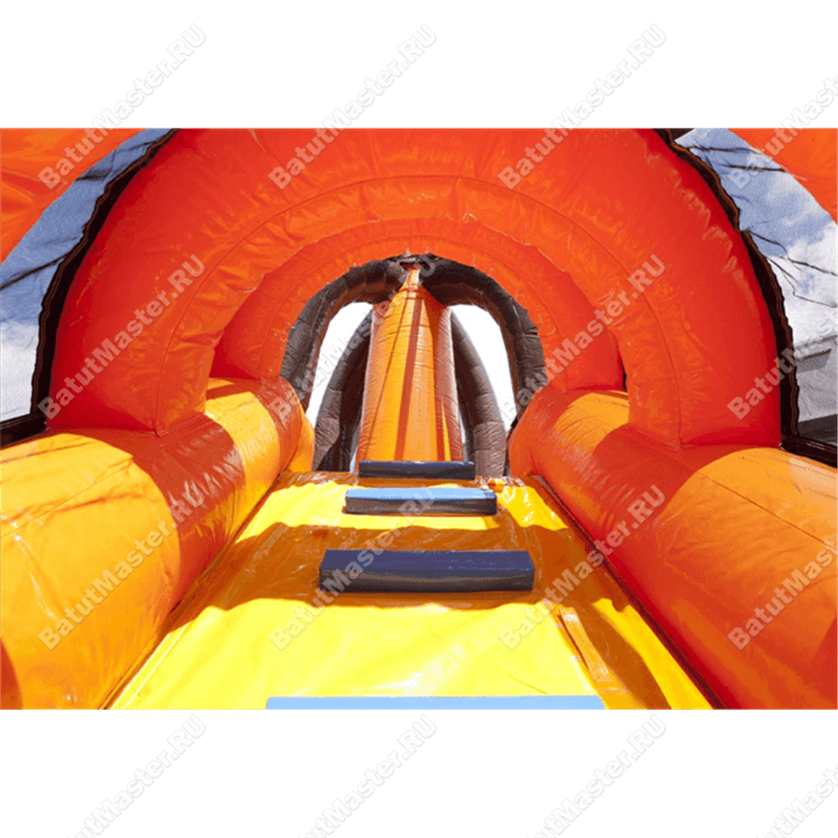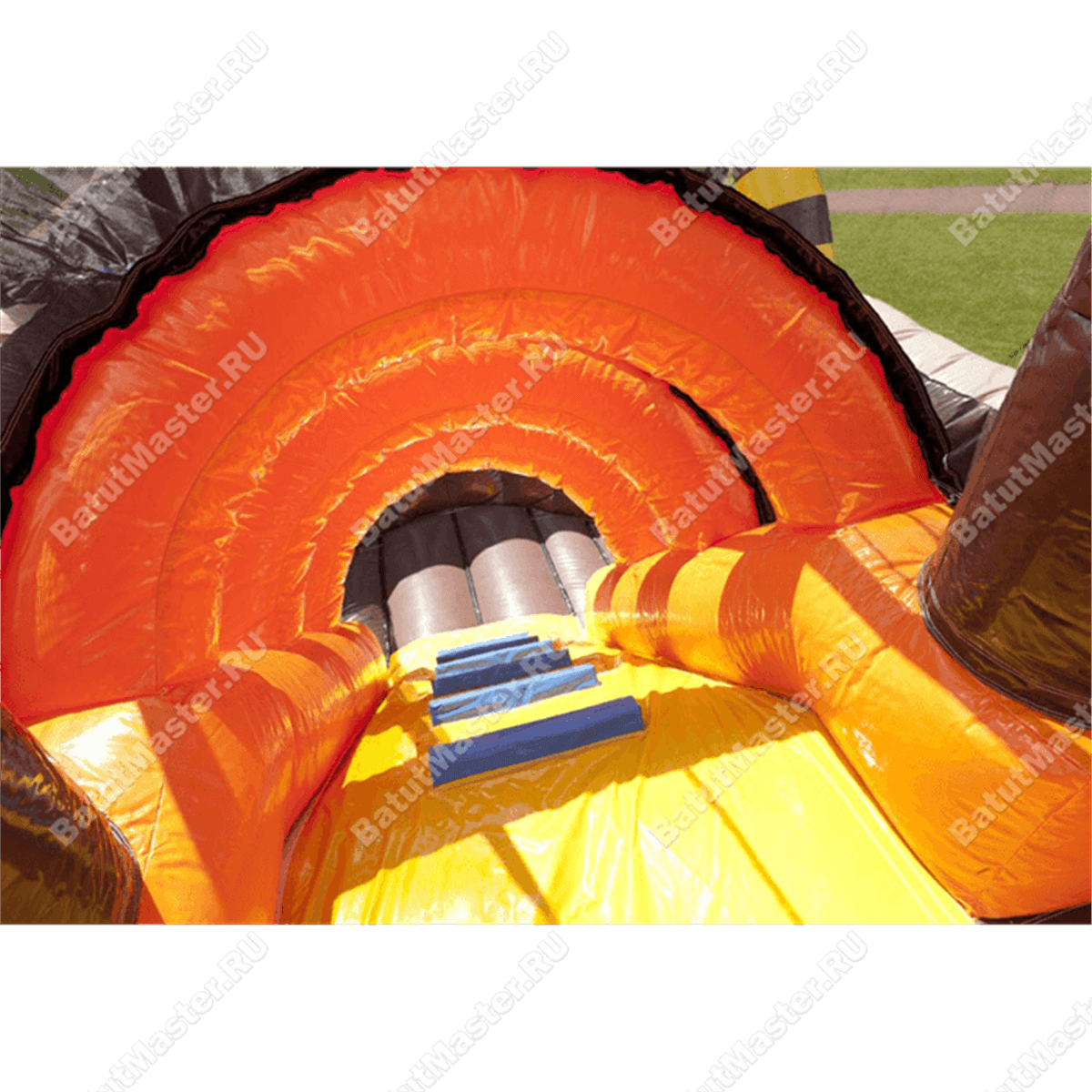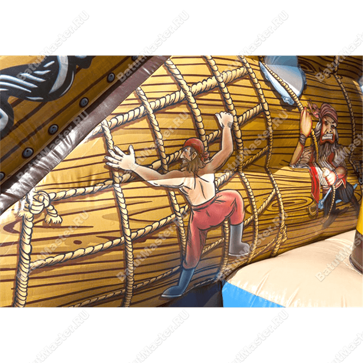 Если внешняя часть надувной шхуны преимущественно красная, то внутренняя – ярко желтая. Поднявшись наверх по лестнице, ребенок якобы попадает на второй этаж – капитанский мостик, но на самом деле теперь он может с замиранием сердца спуститься вниз с высокой и крутой горки. Чтобы батут выглядел как можно правдоподобнее, на нем установлен штурвал, нарисованы канатные лестницы, двери, окна и т. д. Историческую эпоху отлично передает изголовье красного дракона, которое закреплено на самой корме судна. Чтобы поддержать игрушечный дух конструкции, наружные стенки украшены изображениями волн и другими завитками.