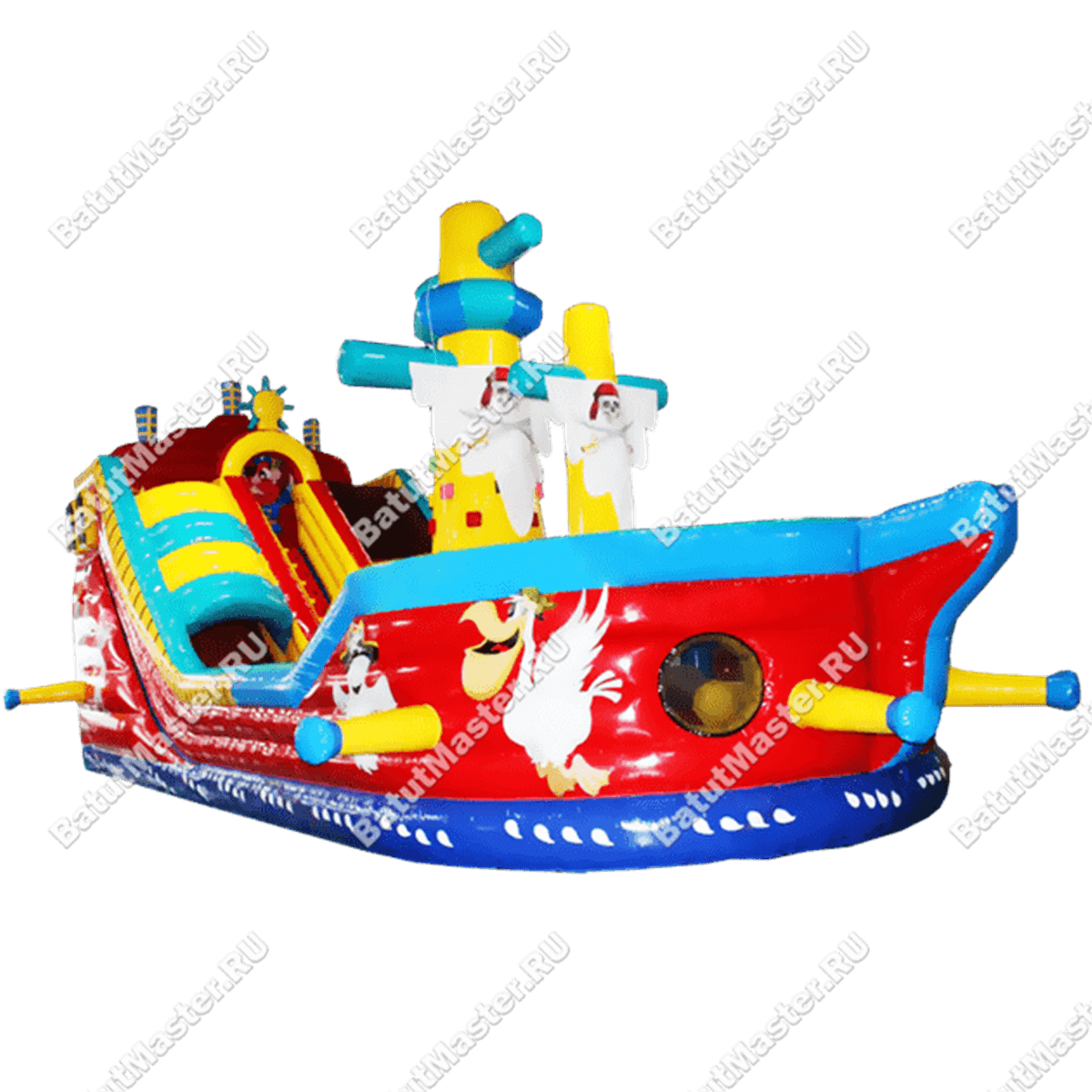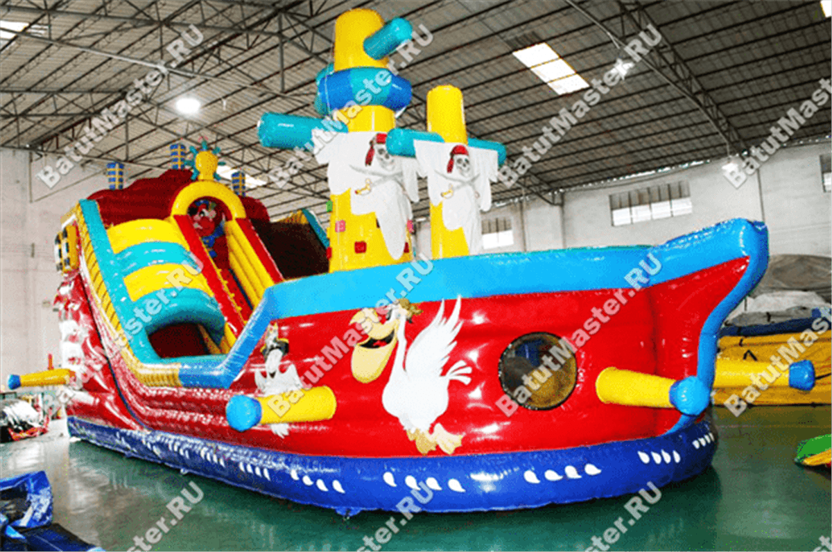 Невозможно поверить, что когда-то обычные надувные батуты сейчас обрели формы настоящих архитектурных фигур. В подтверждение этому мы можем увидеть представленный надувной корабль, созданный для бизнеса. Флаги с изображениями пиратов на двух мачтах свидетельствуют о том, что корабль выполнен в исторической тематике. Но присутствие разбойнического духа на корабле детям только придает радости и веселья, поэтому под пиратским флагом развлечения проходят еще увлекательней.