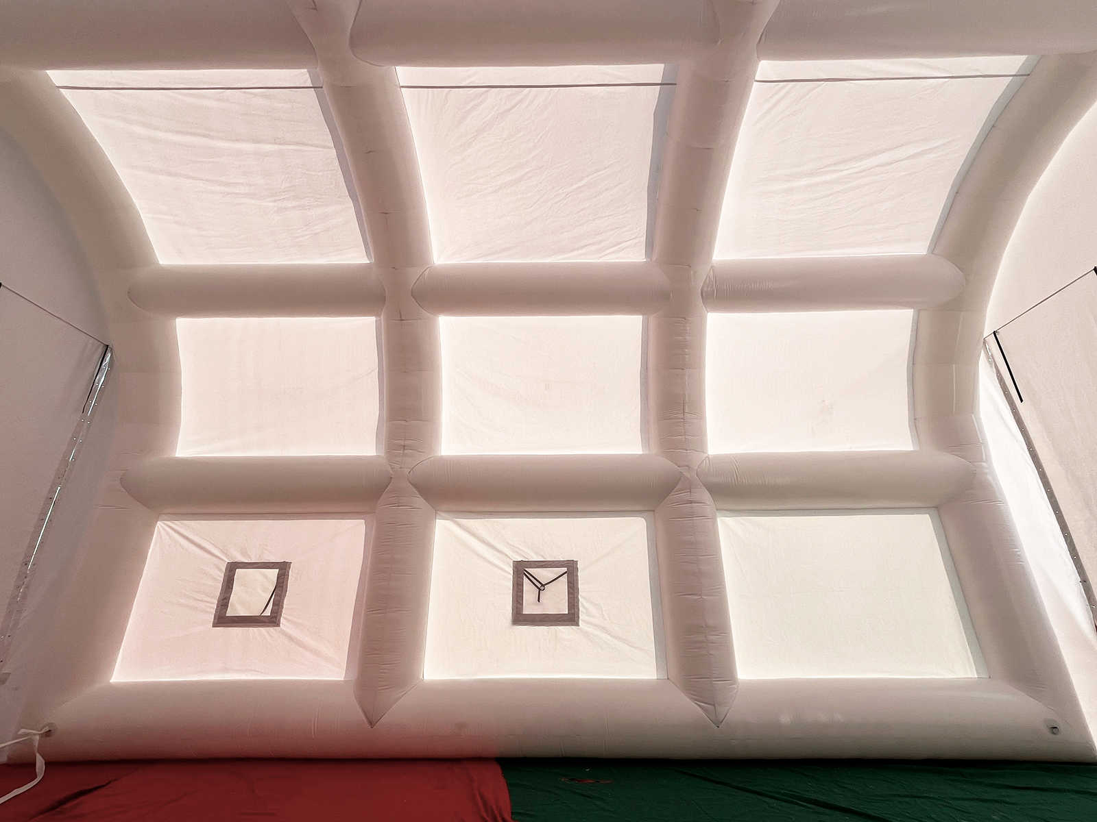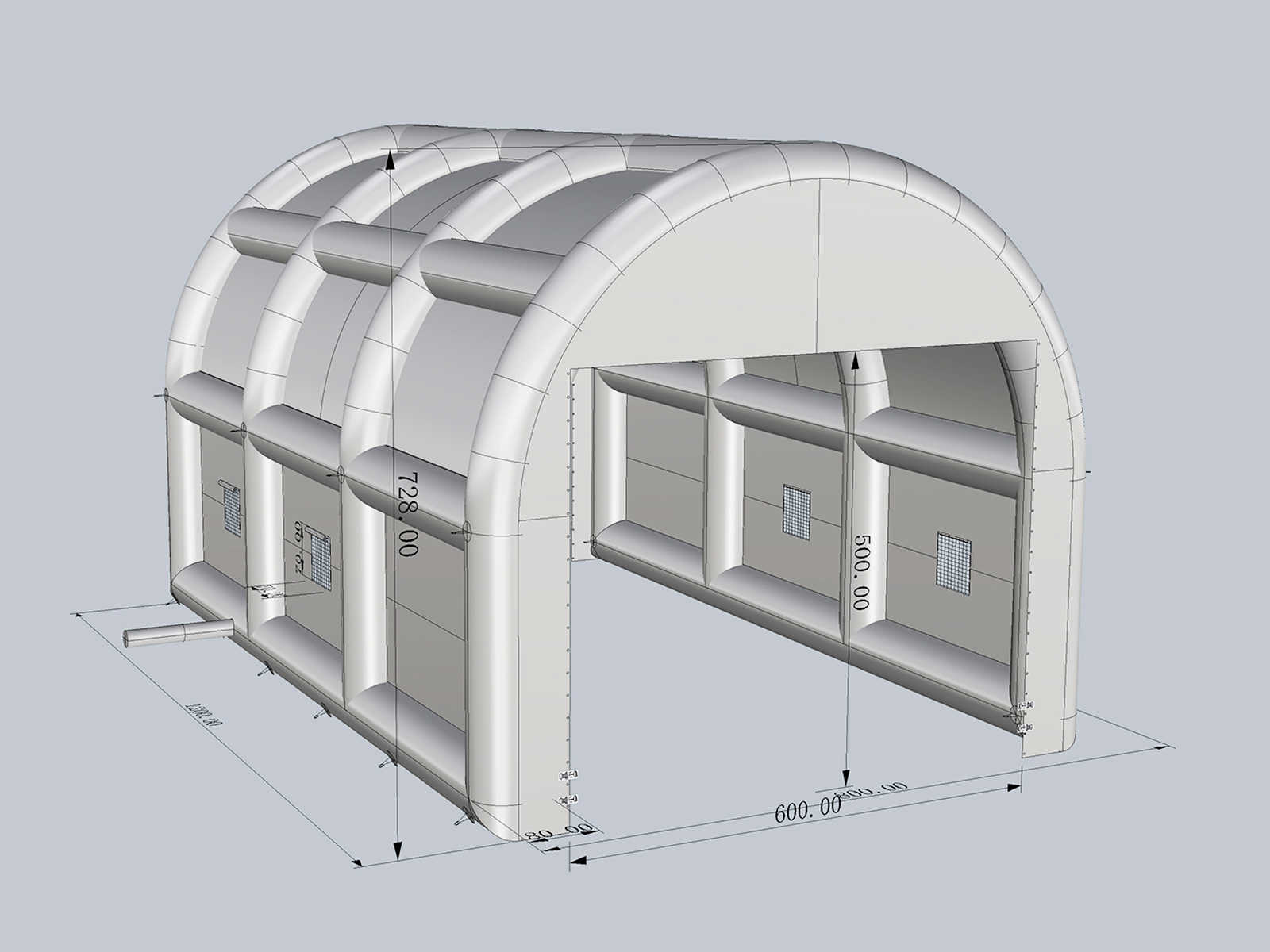 Каркас шатра выполнен из плотной армированной ПВХ-тканью с показателем 690 г/м² и толщиной 0,55 мм. Этот материал не только устойчив к механическим повреждениям, но и обладает высокой водо- и ветрозащитой. Вся конструкция работает на постоянном поддуве, что позволяет поддерживать оптимальное давление внутри каркаса и сохранять форму даже при неблагоприятных погодных условиях.