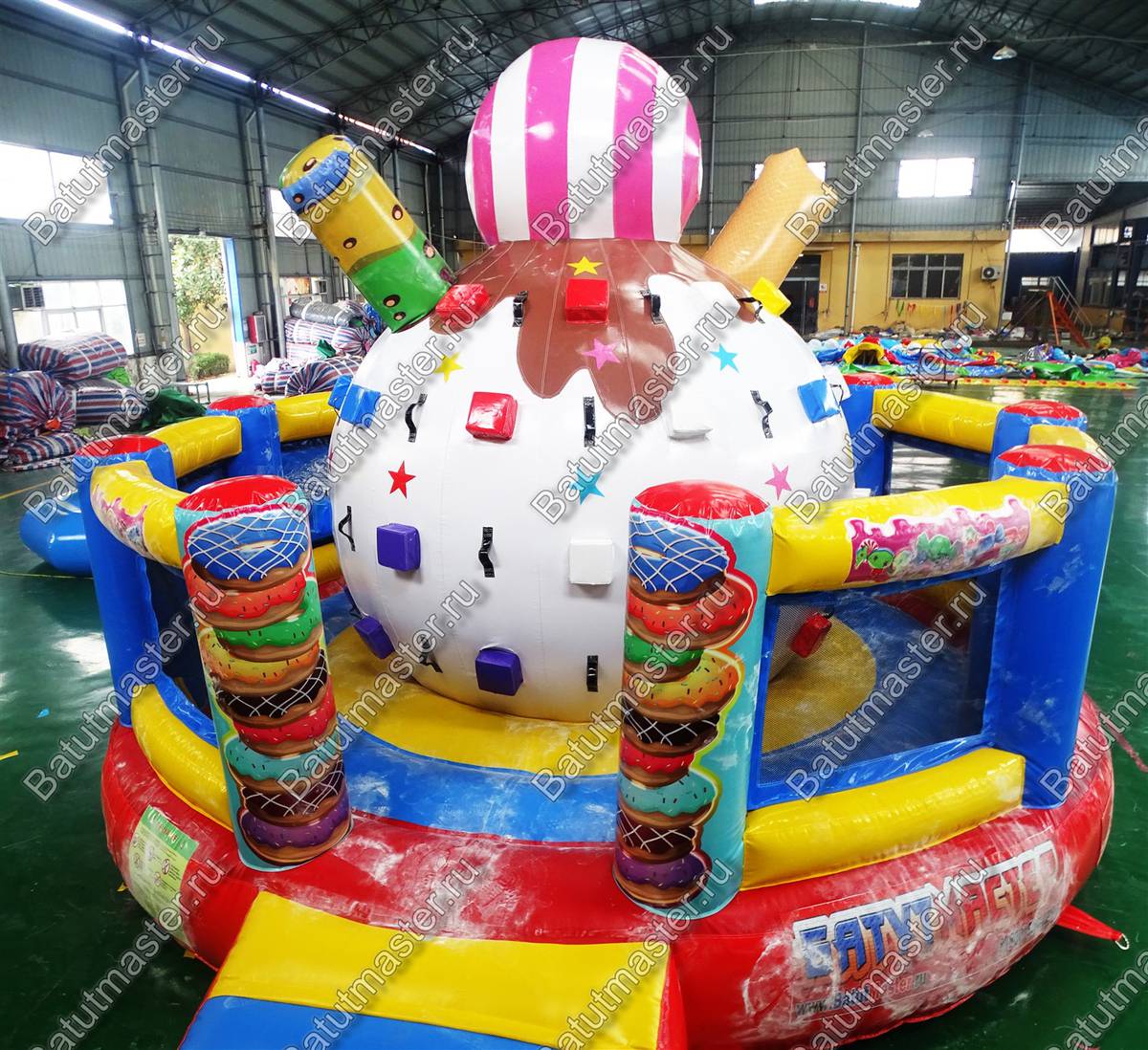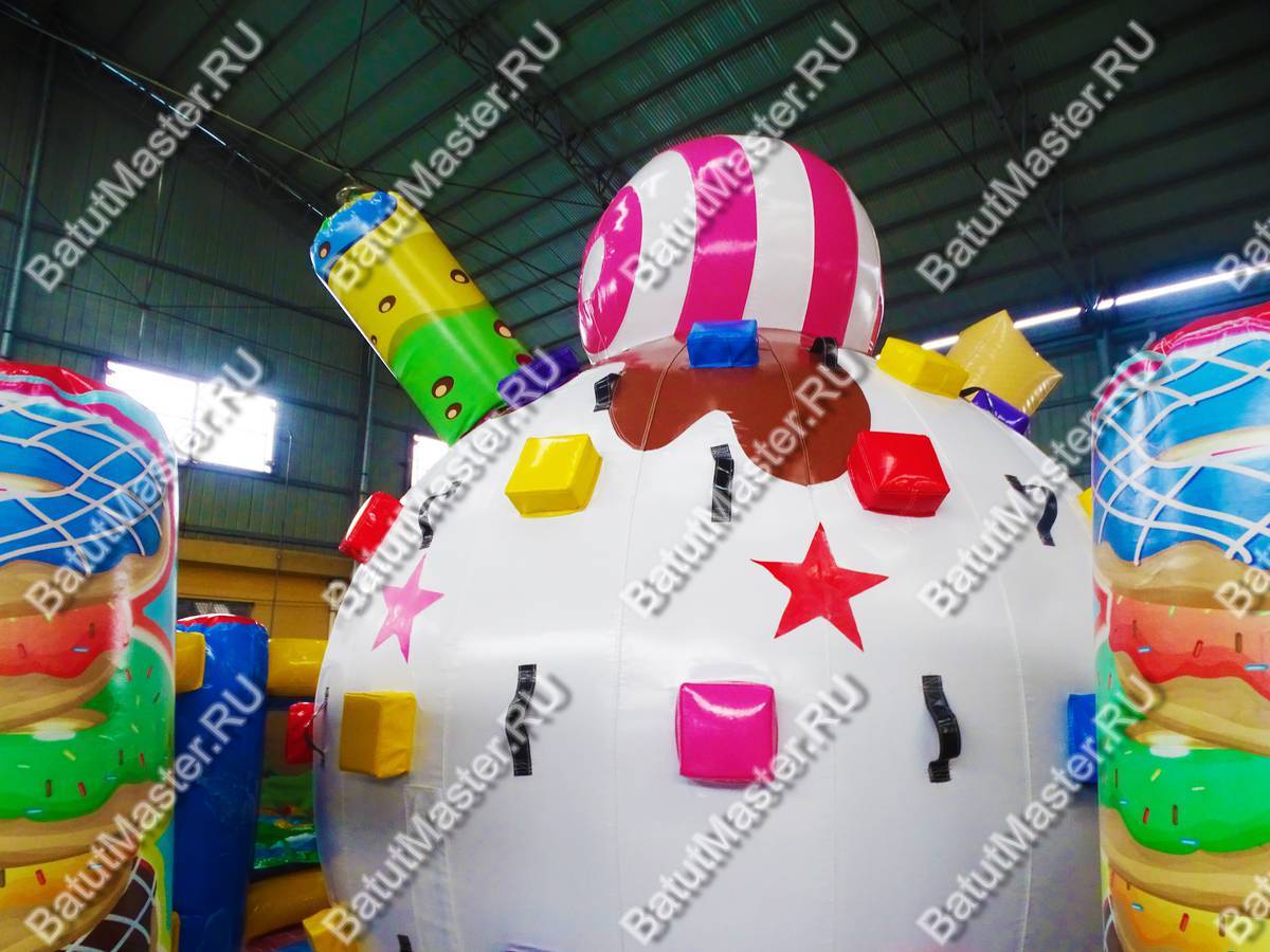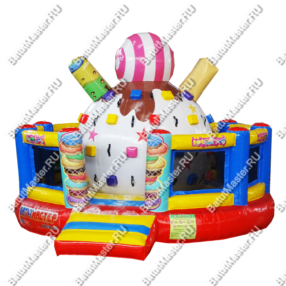 Скалодром «Мороженое» - это яркий, тематичный надувной комплекс, который непременно порадует маленьких первооткрывателей. Выполнен в необычной форме любимой сладости у детей – мороженого. Посередине надувного батута размещен один большой надувной шарик мороженого, на который так интересно будет забираться детям по мягким, разноцветным щитам. По всему периметру он окружен вертикальными столбцами и прочной сеткой. Таким образом, дети, в случае неудачного спуска не выпадут наружу и не поранятся. Вход скалодрома украшен рисунками в виде пирожных, что поддерживает его тематику.