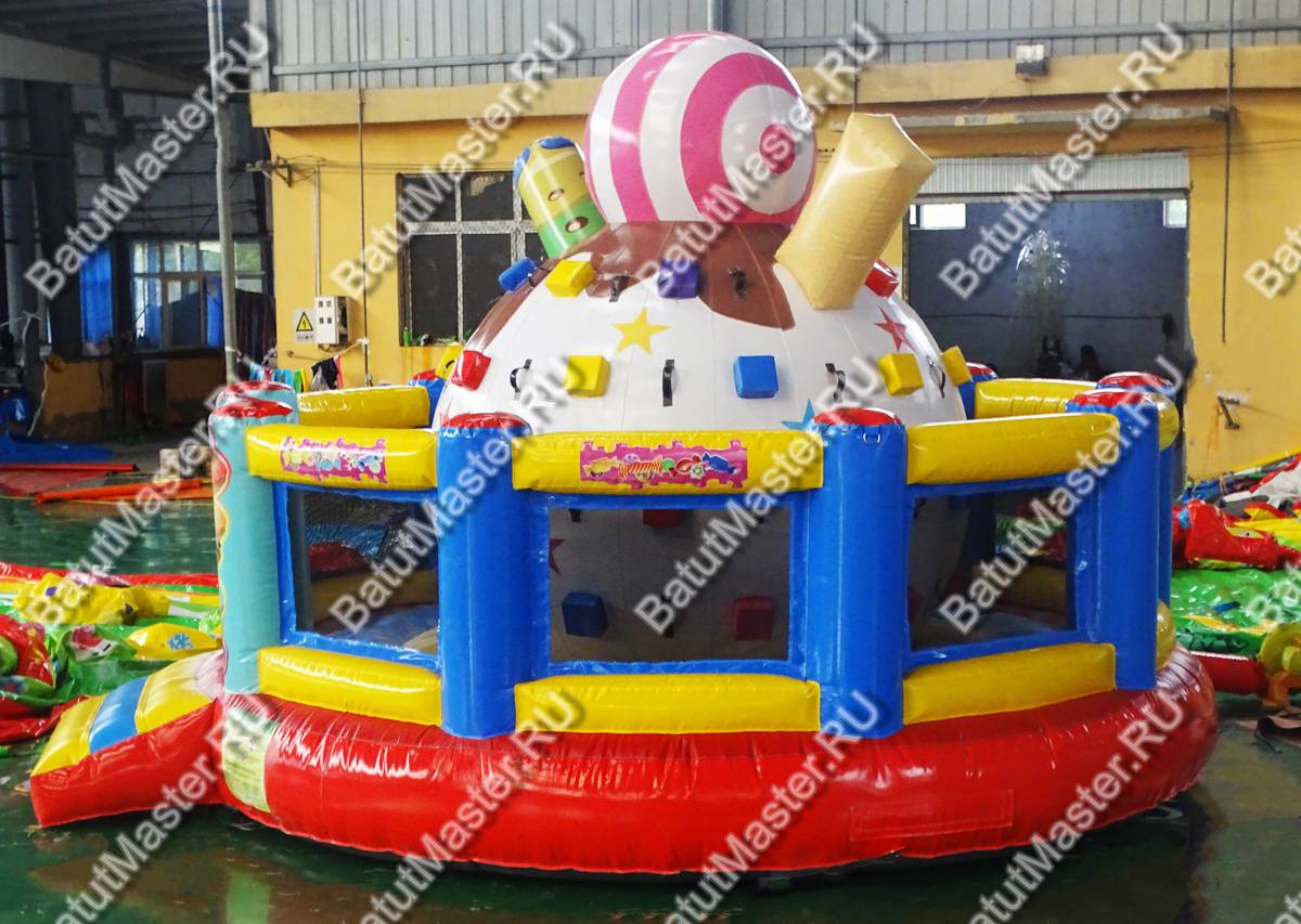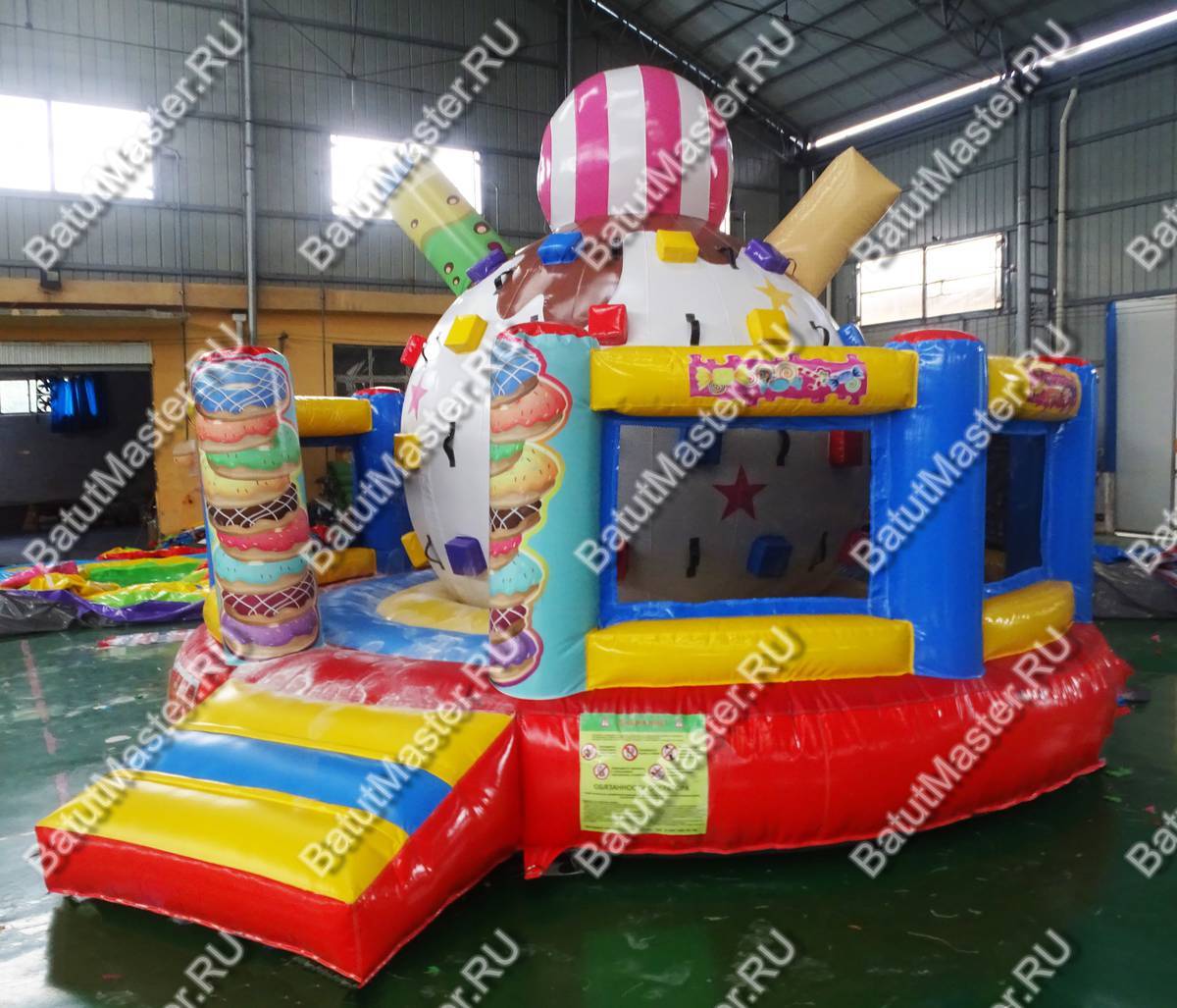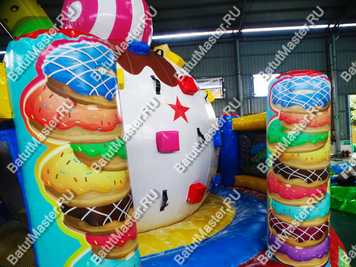 Скалодром «Мороженое» - это яркий, тематичный надувной комплекс, который непременно порадует маленьких первооткрывателей. Выполнен в необычной форме любимой сладости у детей – мороженого. Посередине надувного батута размещен один большой надувной шарик мороженого, на который так интересно будет забираться детям по мягким, разноцветным щитам. По всему периметру он окружен вертикальными столбцами и прочной сеткой. Таким образом, дети, в случае неудачного спуска не выпадут наружу и не поранятся. Вход скалодрома украшен рисунками в виде пирожных, что поддерживает его тематику.