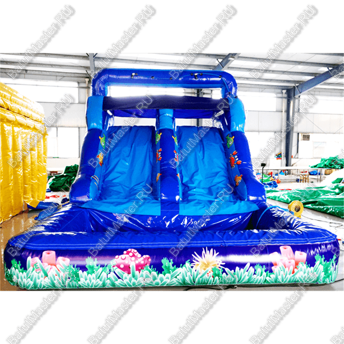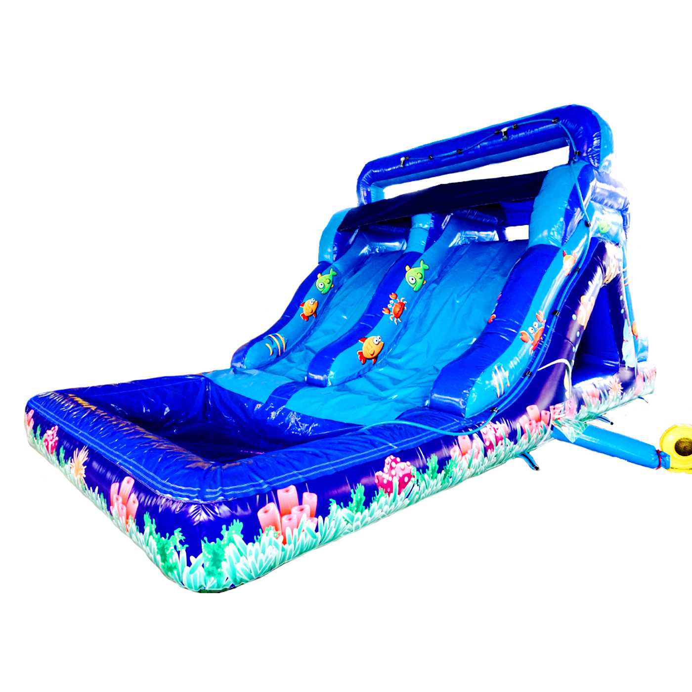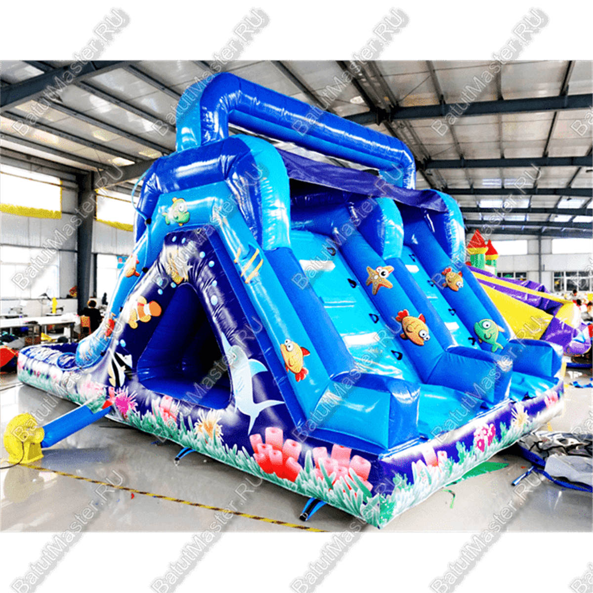 Надувной аквапарк «Коралловые рифы» – это многофункциональный аттракцион, который обеспечит незабываемые эмоции и активный отдых для детей. Комплекс включает просторный батут, две горки и вместительный бассейн. Яркие морские цвета и тематика подводного мира с изображениями рыбок привлекают внимание и создают атмосферу летнего приключения.