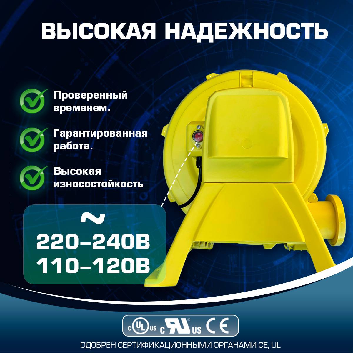 Это хороший насос для батутов любого размера, благодаря простоте конструкции такое устройство прослужит вам долго и надежно. Высокая мощность приспособления позволяет за короткое время надуть и сохранить форму огромного габаритного аттракциона, а благодаря компактным размерам насоса, установить дополнительное устройство можно в удобном и незаметном для посетителей месте.