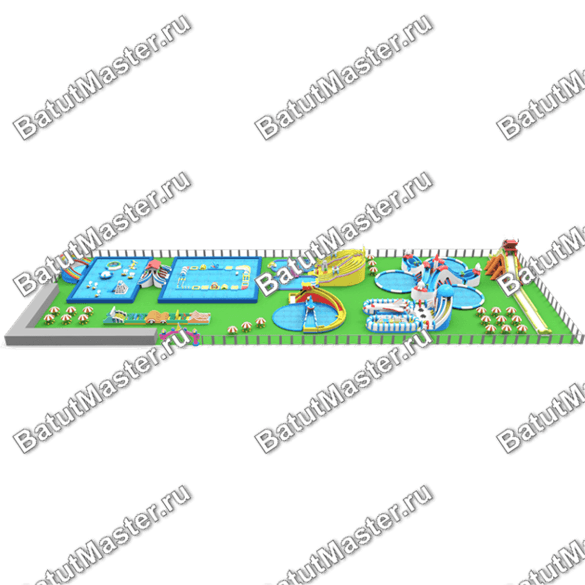 В этой конструкции собраны горки разных модификаций, они могут опускаться в воду или просто на землю, взбираться на них можно по ступенькам или скале. Каждый элемент рассчитан на определенный возраст ребенка, поэтому все дети обязательно найдут для себя интересное увлечение. Главными элементами надувного аквапарка являются: 2 больших бассейна с общей горкой, высокая горка с фигурой динозавра сверху, извилистые спуски и подъемы с тремя круглыми бассейнами вокруг, а также еще несколько игровых фигур, которые отлично сочетаются с препятствиями.