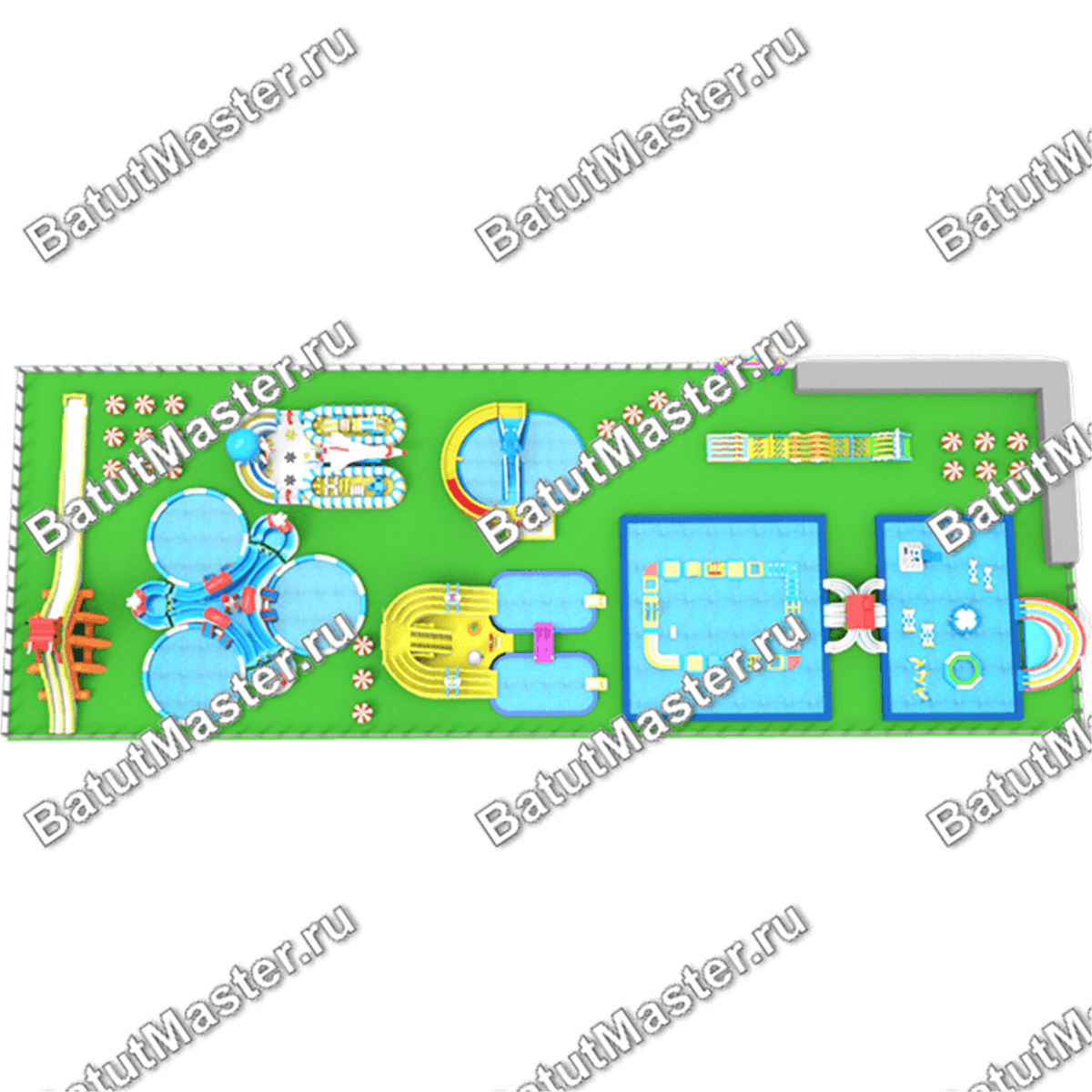 Огромный наземный аквапарк с множеством зон для прыжков и для бега сможет полноценно заменить любой другой парк аттракционов. Его мобильность и легкость монтажа позволяют владельцу оказаться в нужное время и в нужном месте. Наземная установка говорит о том, что пора забыть о необходимости иметь рядом водоем – теперь аквапарк можно за 2 часа построить прямо среди центральной площади города.