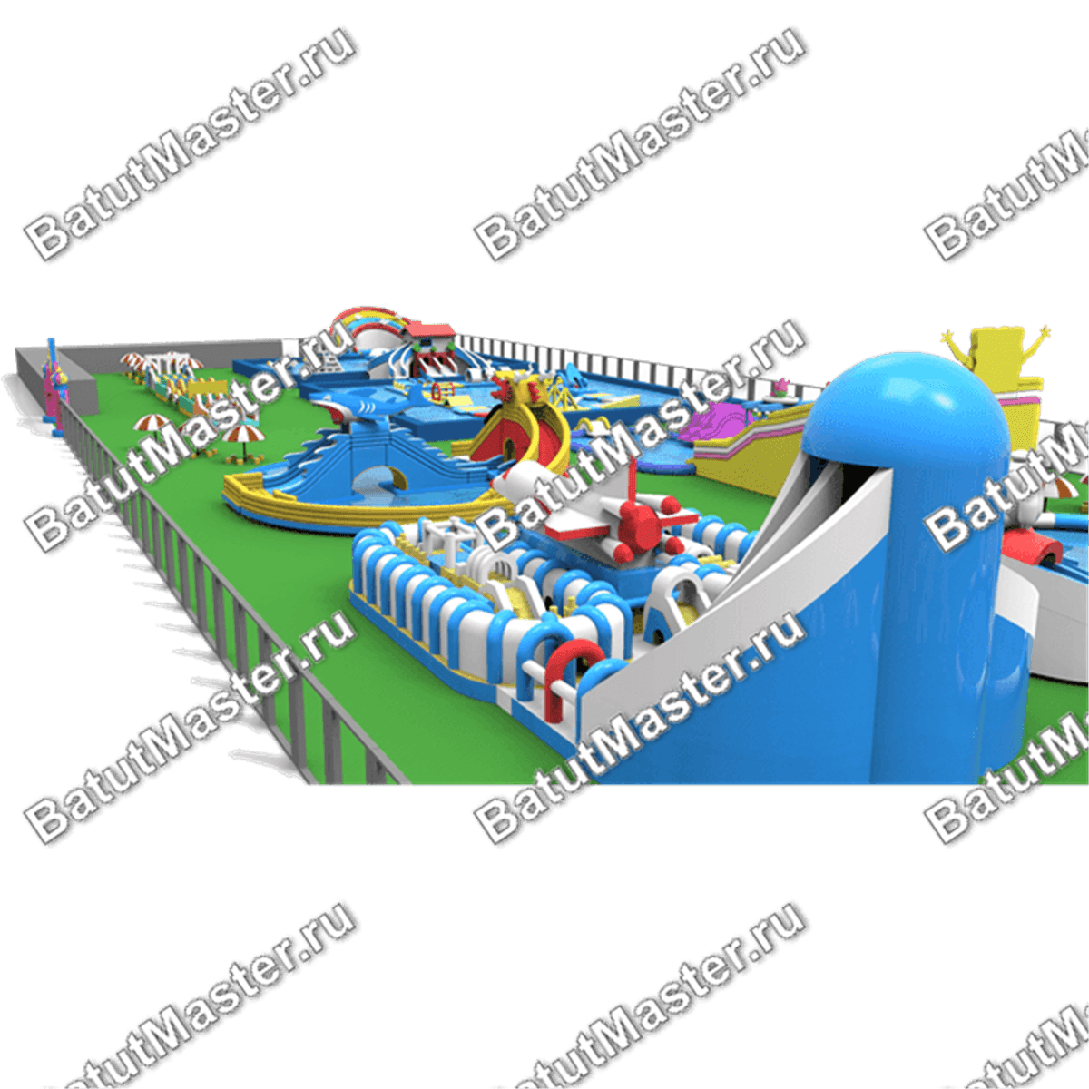 Что больше всего привлекает и манит детей? Конечно, это пестрые и яркие цвета, разные формы и фигуры животных и сказочных героев, препятствия и другие элементы. Это все можно встретить в одном огромном наземном аквапарке, который может разместиться на какой угодно поверхности, включая и побережье. Сразу на входе малыши обязательно устремятся к горке, которая может их привести сразу к двум бассейнам прямоугольной формы. За ними установлена два небольших бассейна и полукруглая горка желтого цвета.