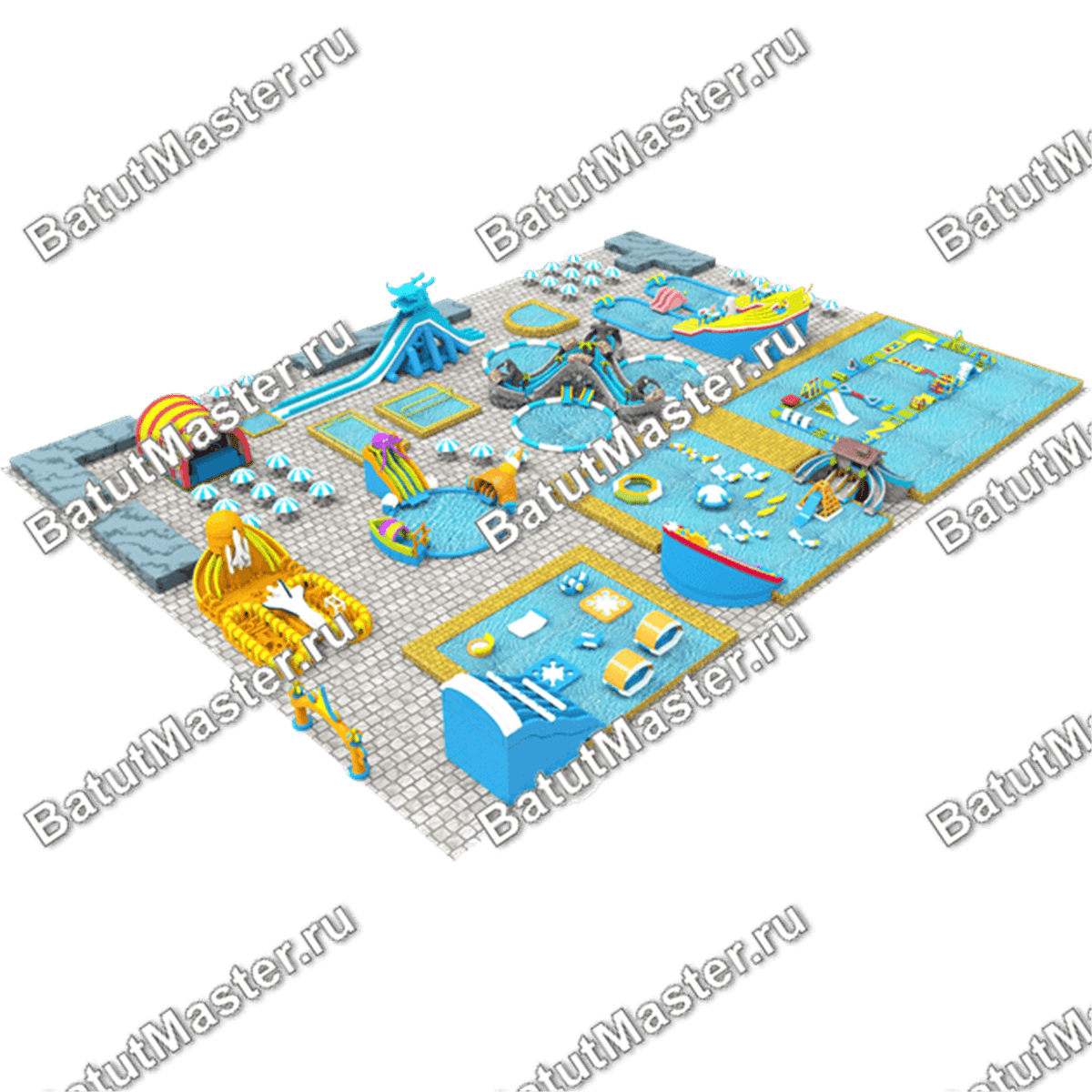Наземный аквапарк с таким изобилием игровых фигур и горок в виде любимых сказочных персонажей обязательно станет излюбленным местом для малышей всего города или пляжа, ведь установить его можно в какой угодно местности. Состоит надувной аквапарк из трех больших бассейнов и 7 маленьких. Каждая водная акватория имеет свои игровые фигуры, горки или домики. Иногда эти элементы получаются смежными: одна сторона своими горками выходит в один бассейн, а другая – в противоположный.