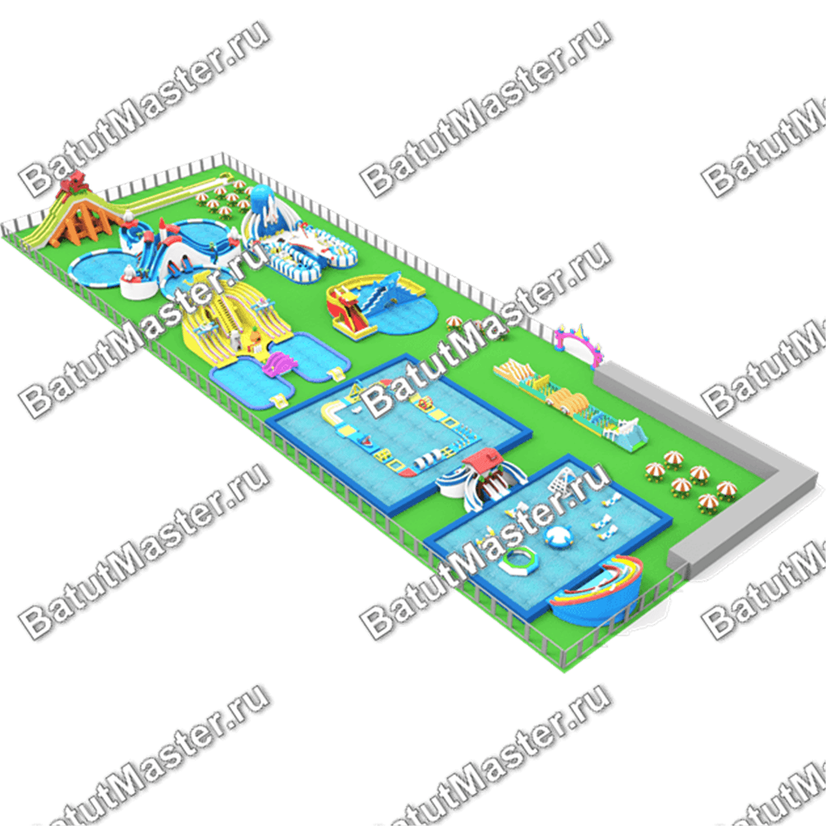 Надувной аквапарка сочетает в себе 3 больших прямоугольных бассейна, 6 небольших, оснащенных пристроенными горками и 3 совсем маленьких для самых энных путешественников. Помимо водных развлечений детей ждут и обычные высокие горки, тоннели, фигуры сказочных персонажей. Также по территории расставлены зонтики для отдыха от солнца. Абсолютно все элементы изготовлены из плотного материала ПВХ, безопасного для здоровья детей и взрослых.