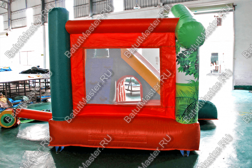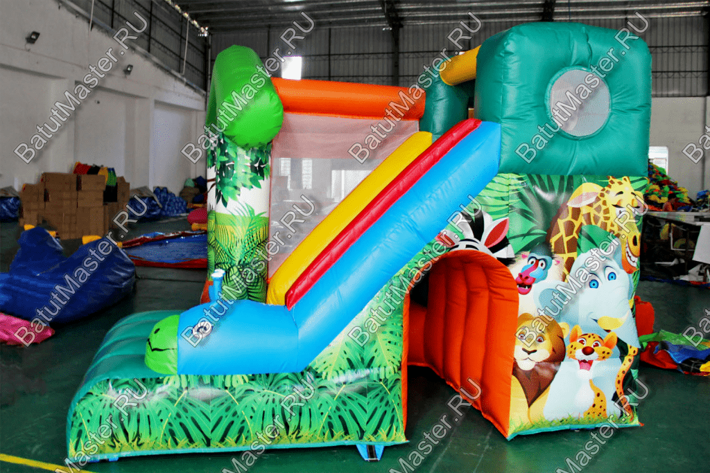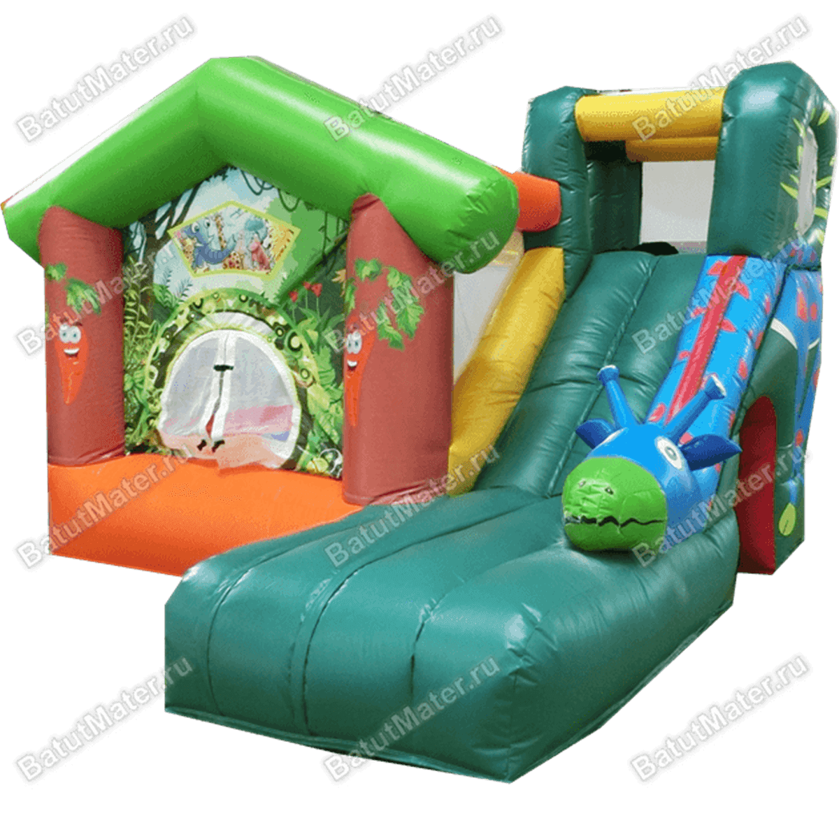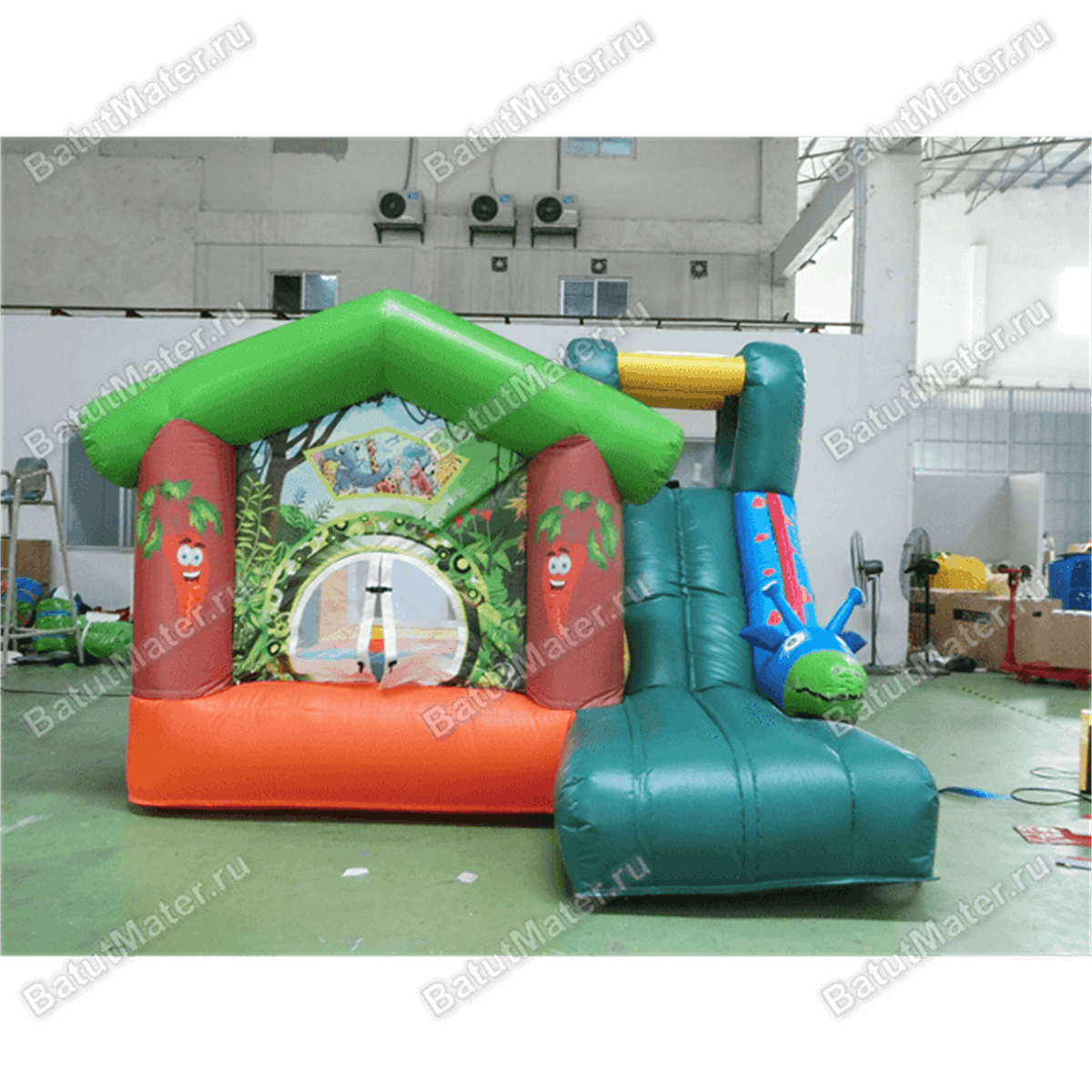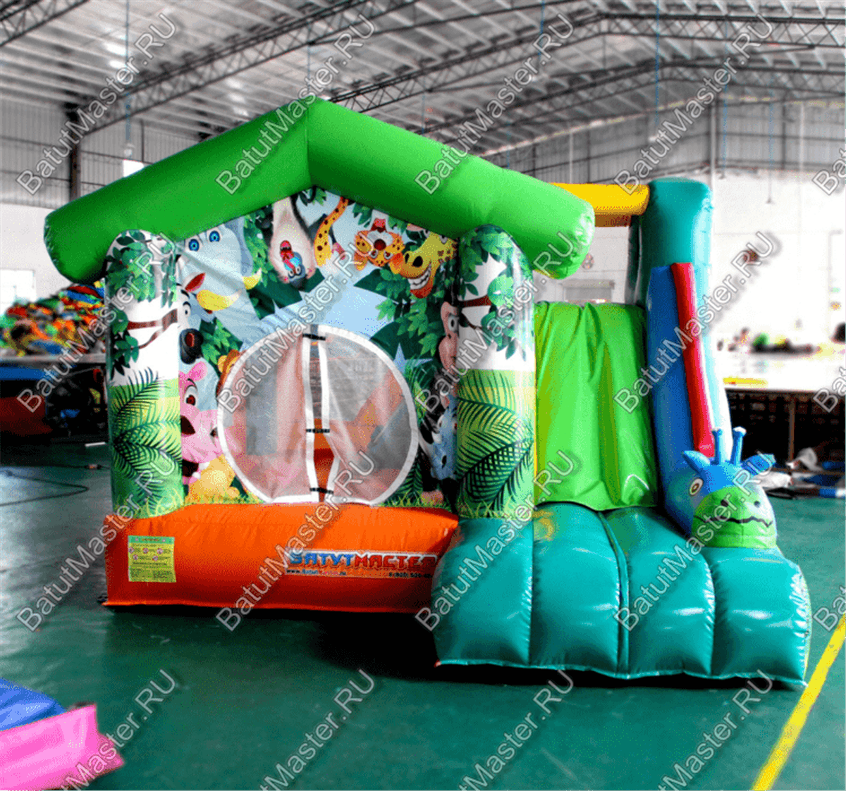 Недорогой батут поделен на 2 основные части: надувная горка и домик для прыжков, бега и игр. Аттракцион выполнен в красках растительности, в каждой составной присутствует зеленый цвет. Вход – через арку домика, расположенную внутри передней стенки из полотна ПВХ, на котором изображены лес, животные и звери.