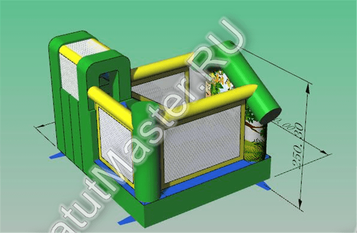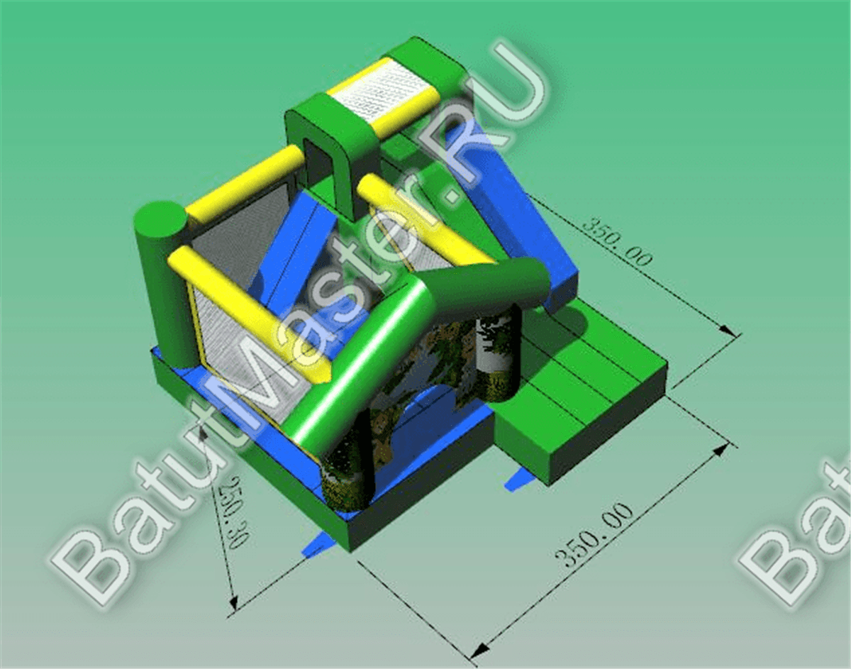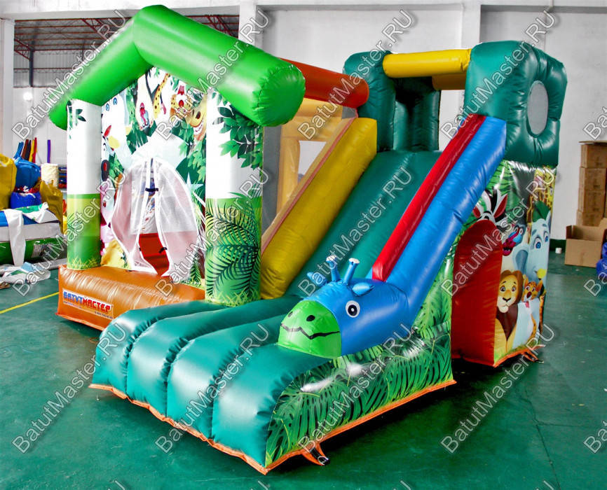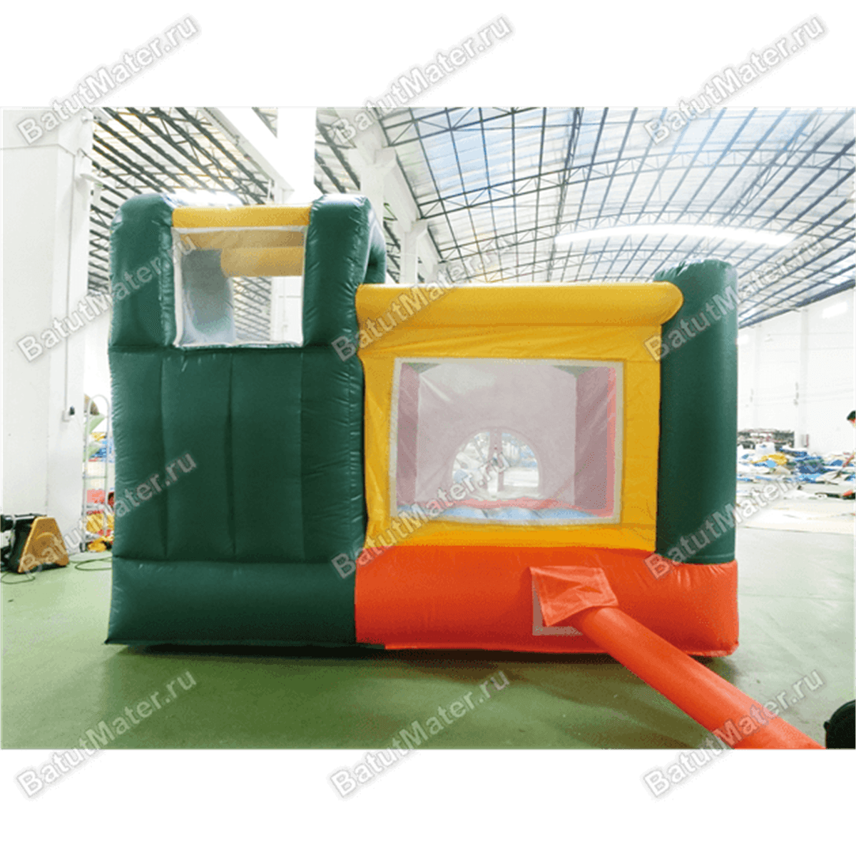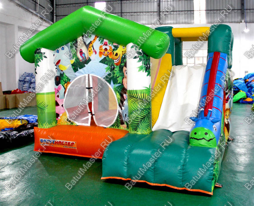 Недорогой батут поделен на 2 основные части: надувная горка и домик для прыжков, бега и игр. Аттракцион выполнен в красках растительности, в каждой составной присутствует зеленый цвет. Вход – через арку домика, расположенную внутри передней стенки из полотна ПВХ, на котором изображены лес, животные и звери.