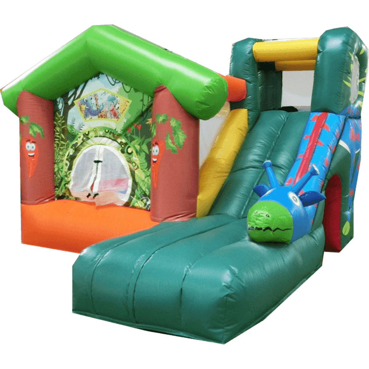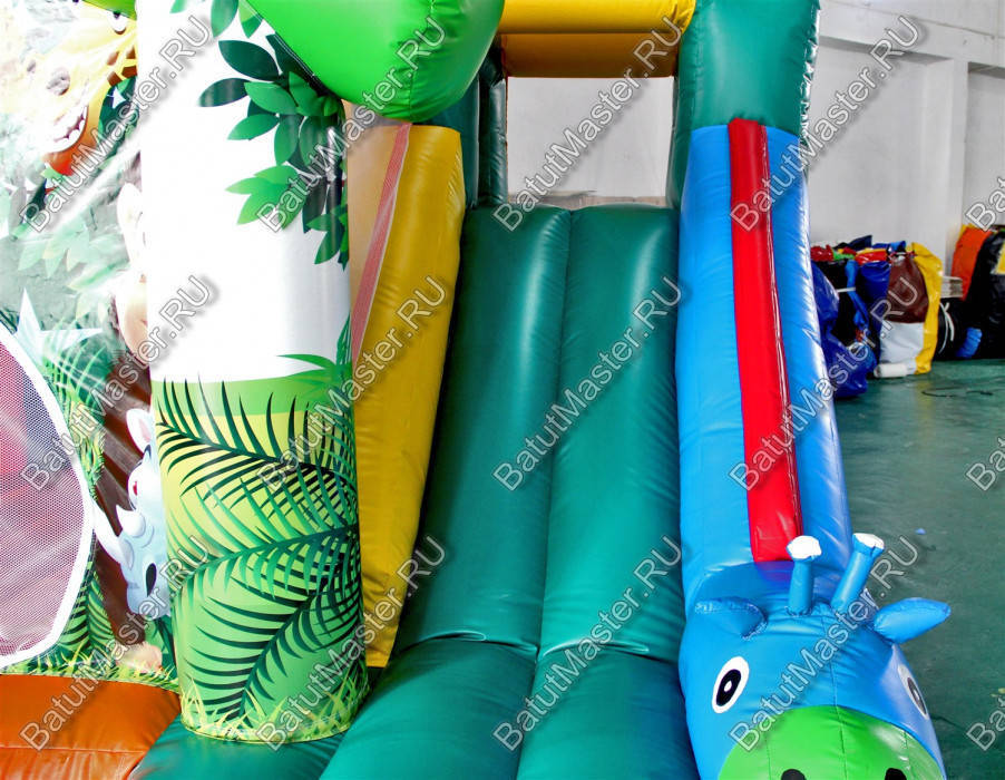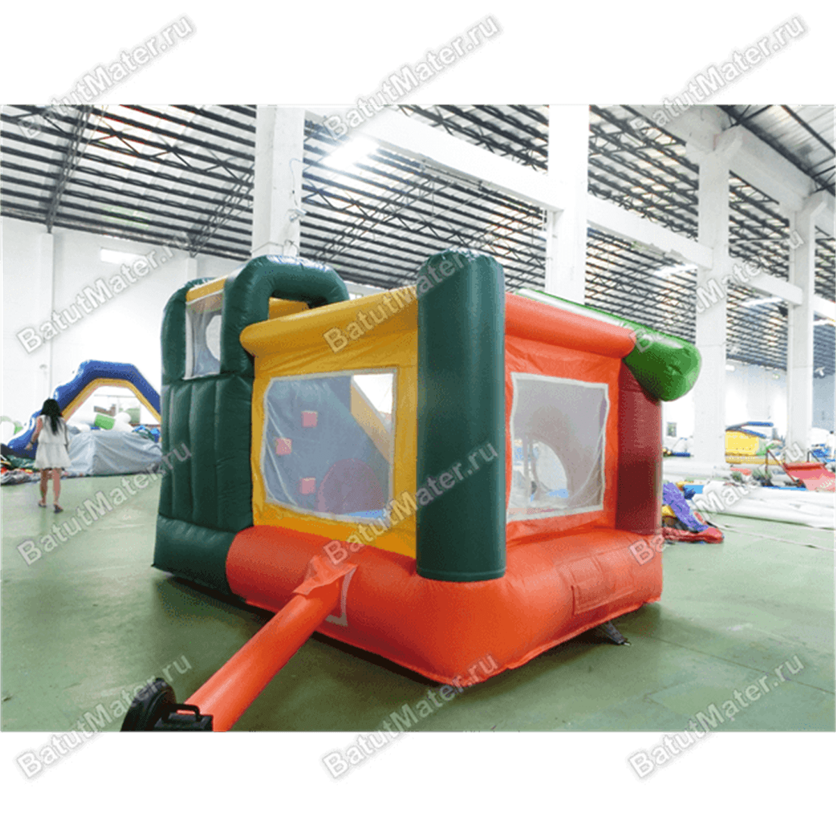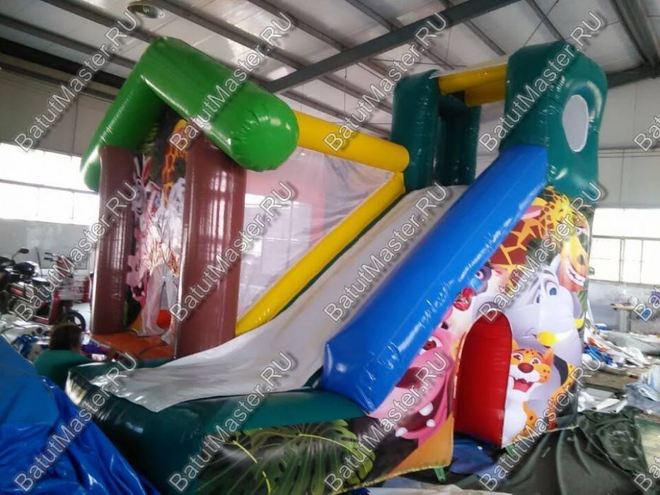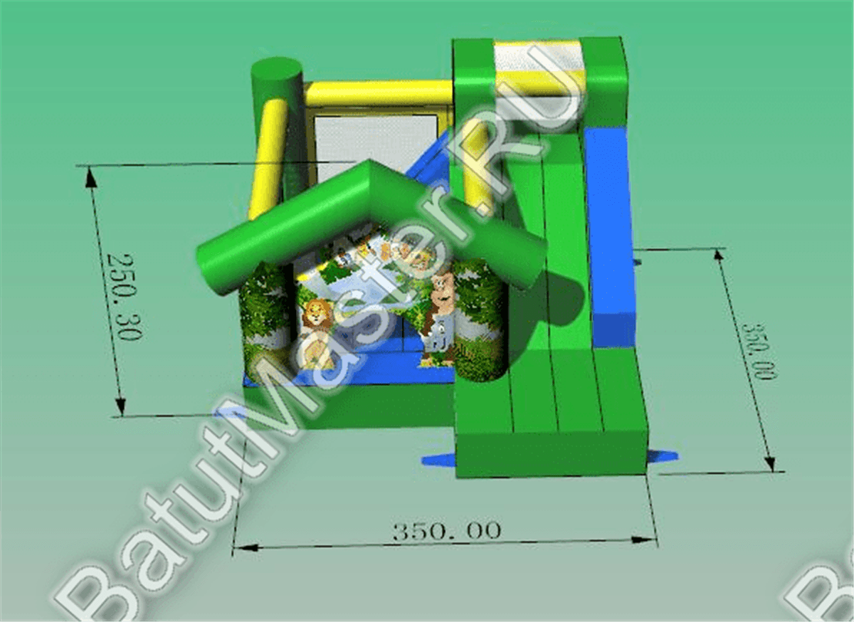 Недорогой батут поделен на 2 основные части: надувная горка и домик для прыжков, бега и игр. Аттракцион выполнен в красках растительности, в каждой составной присутствует зеленый цвет. Вход – через арку домика, расположенную внутри передней стенки из полотна ПВХ, на котором изображены лес, животные и звери.