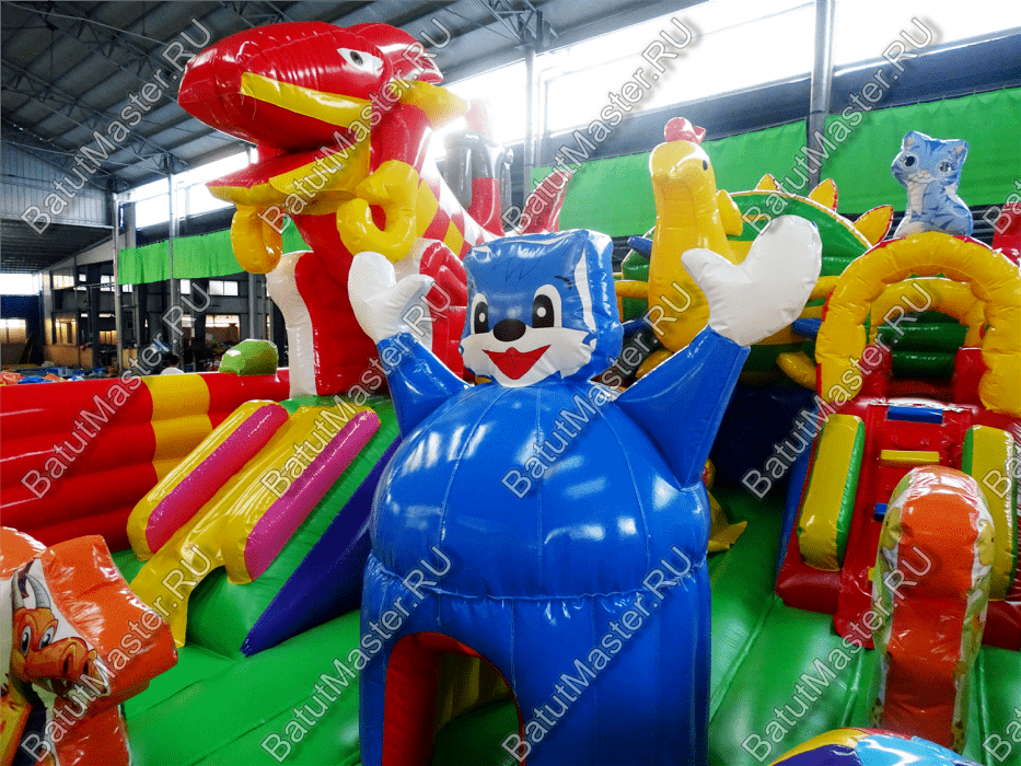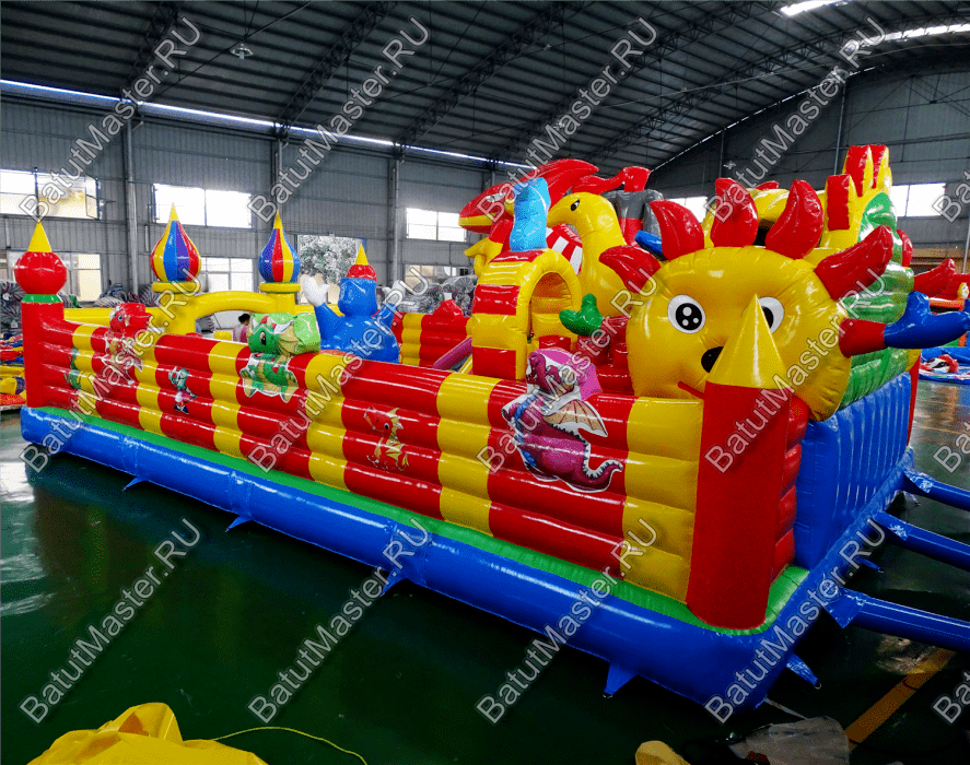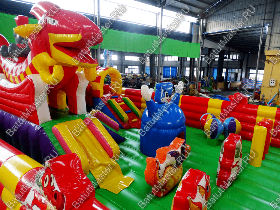 Коммерческий надувной батут «Красный дракон» является целой площадкой с различными интересными аттракционами. Отличный вариант для бизнеса, потому что каждый найдёт развлечение по душе. Тут есть множество надувных фигур в виде драконов и вертикальные груши – со всеми этими предметами можно взаимодействовать и играть. Также тут присутствуют различные конструкции: арки и горки, представляющие собой целый комплекс. Несмотря на плотность аттракционов, есть место и для бега.