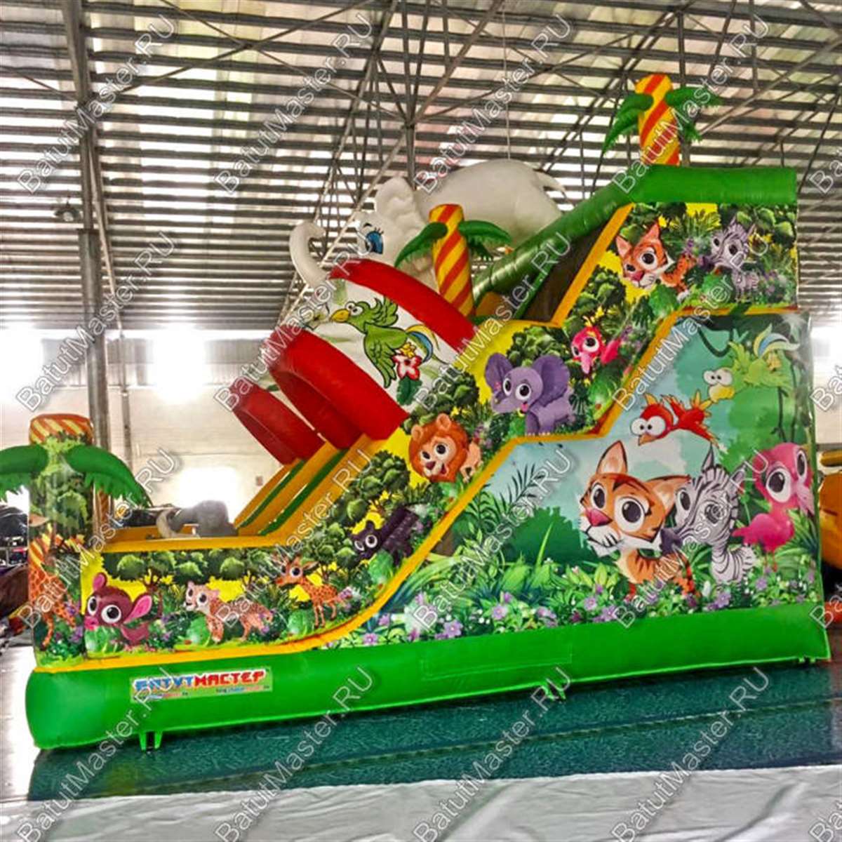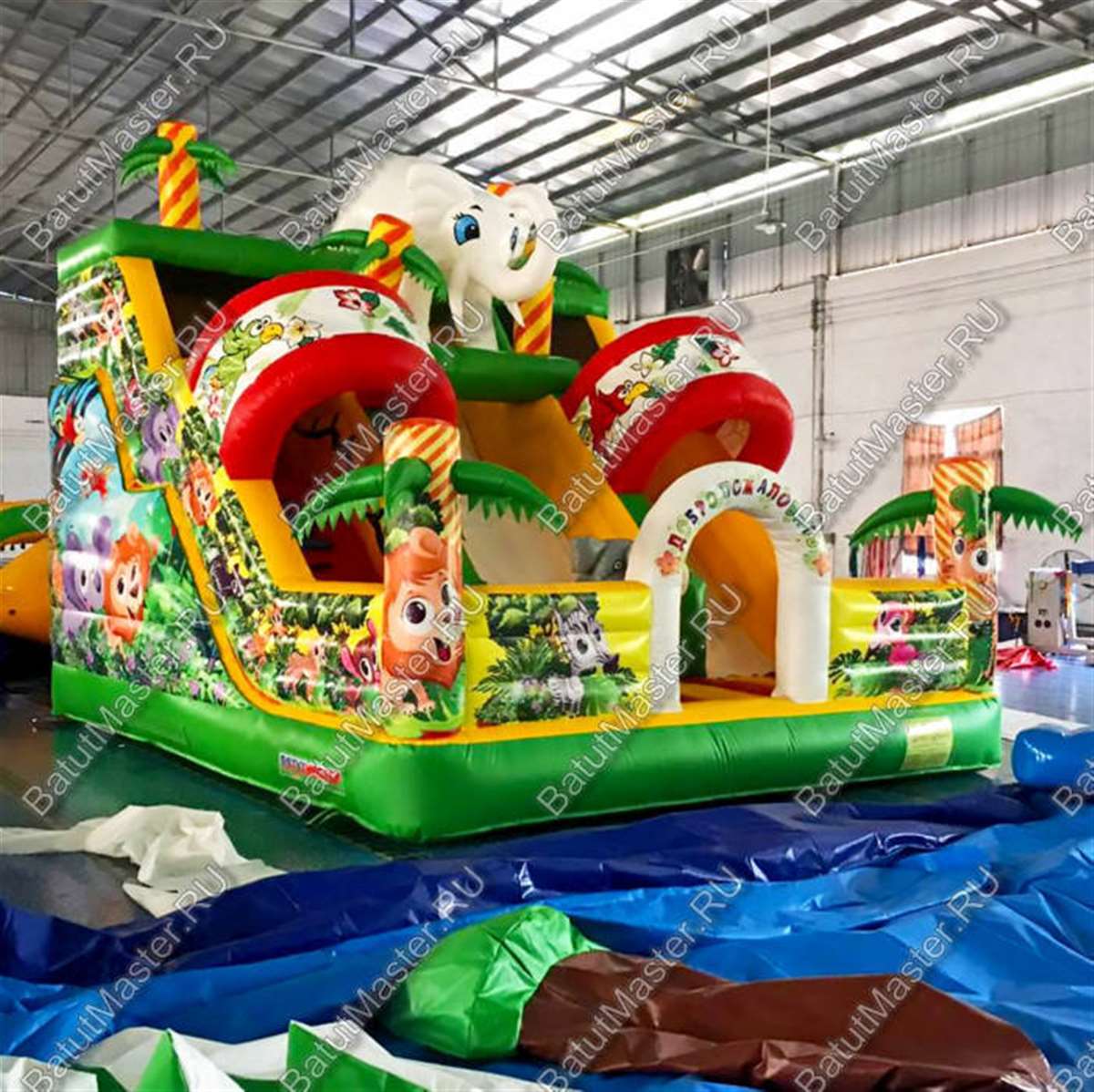 Вход на надувной батут выполнен в виде арки, прямо как в зоопарке. В первую очередь в глаза бросает большой белый слон наверху аттракциона: он радостно приветствует детей в своих надувных джунглях. Как только они пройдут внутрь, их встретит ещё один слон, правда, уже серый.
