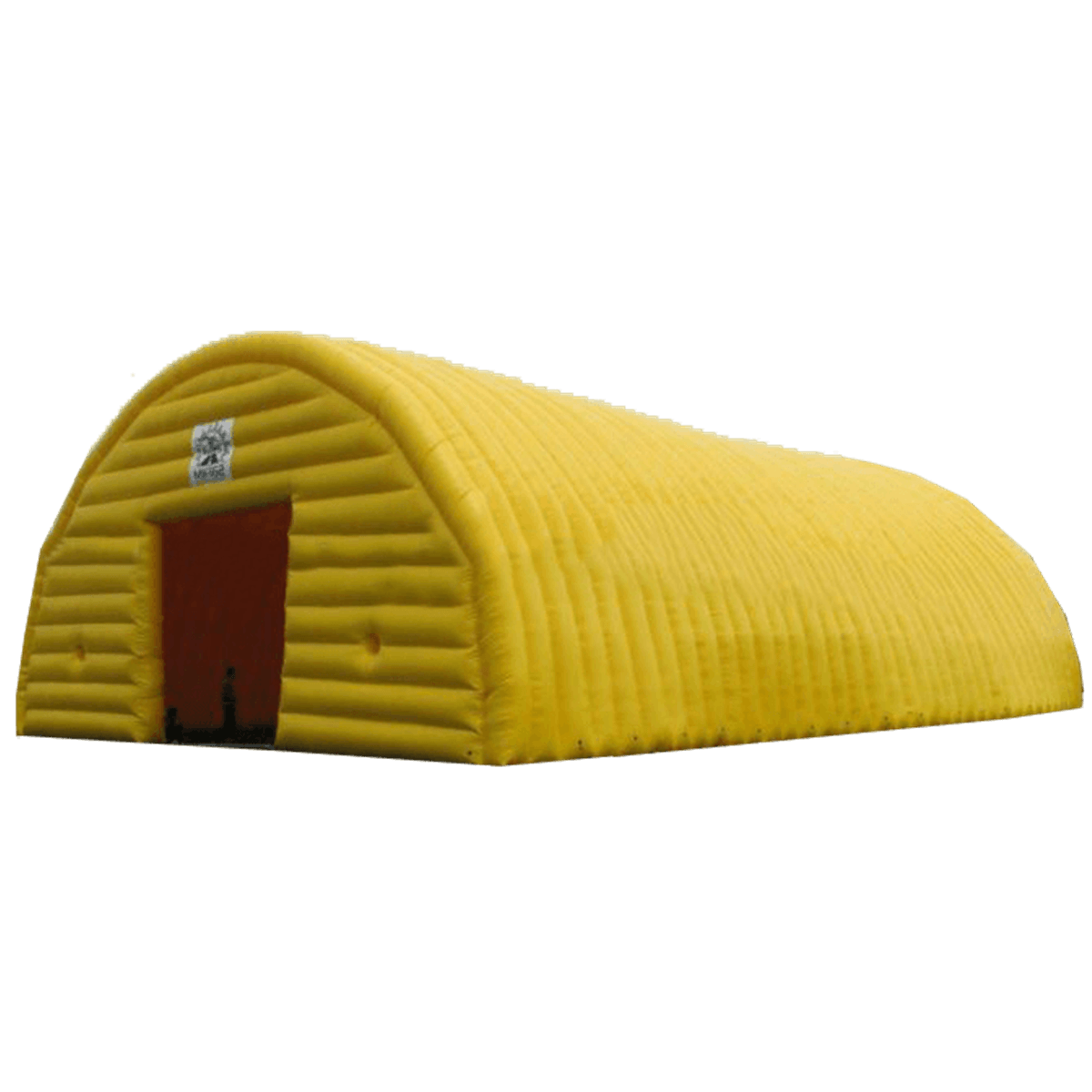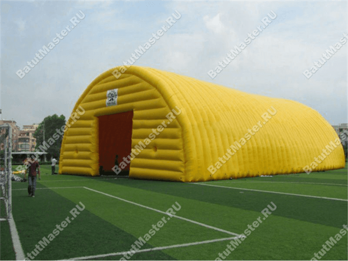 Данный пневмоангар спроектирован просто и понятно, изготовлен из ярко желтого ПВХ, а его верхняя часть передает лаконичные грани арки, которые монолитны с основной конструкцией. В надувном шатре не предусмотрены окна, а только дверные проему, но от этого помещение не перестало быть светлым – солнечные лучи создают внутри конструкции особенно теплую атмосферу. А если вам понадобится более яркое освещение, то вы сможете воспользоваться специальными фиксаторами для осветительного оборудования.