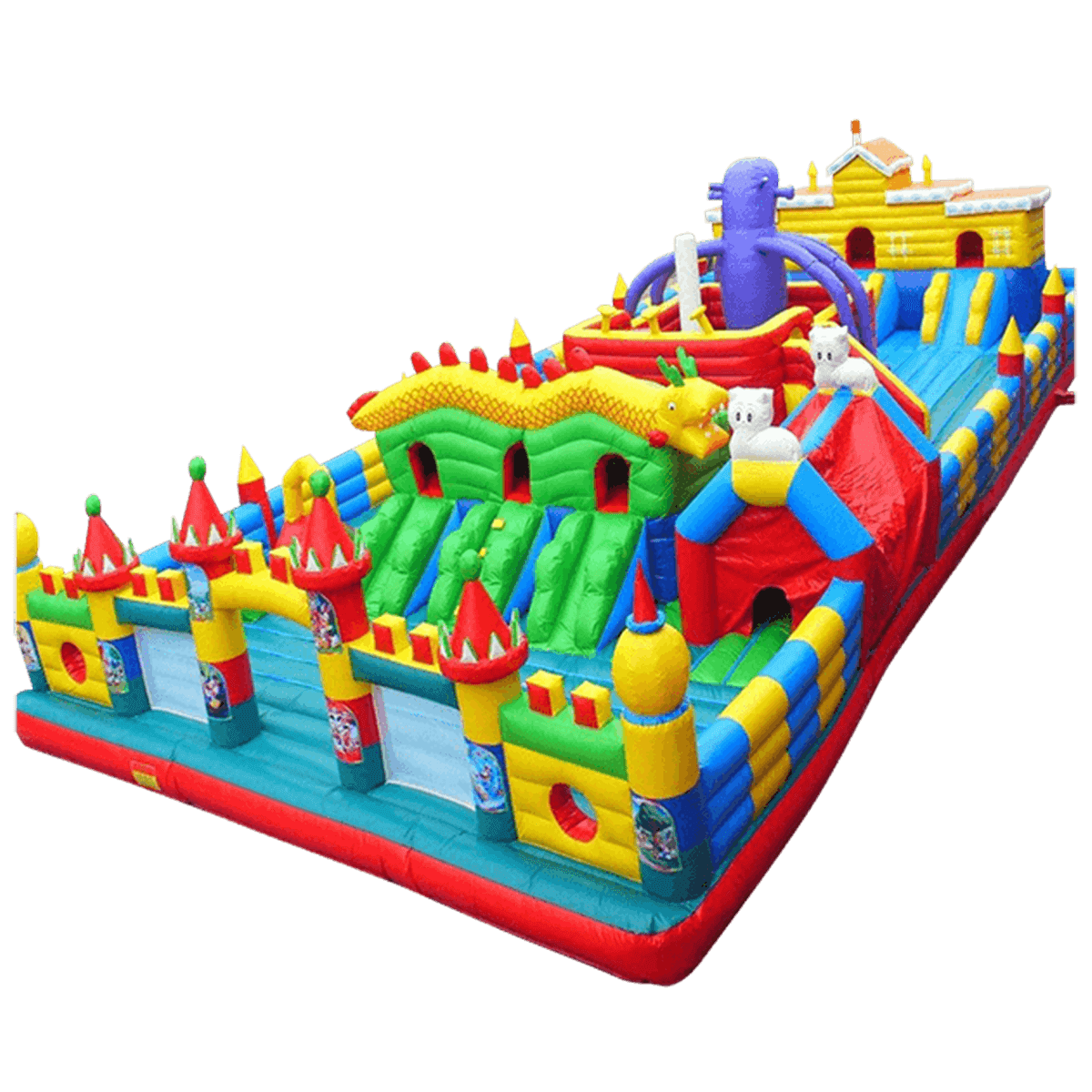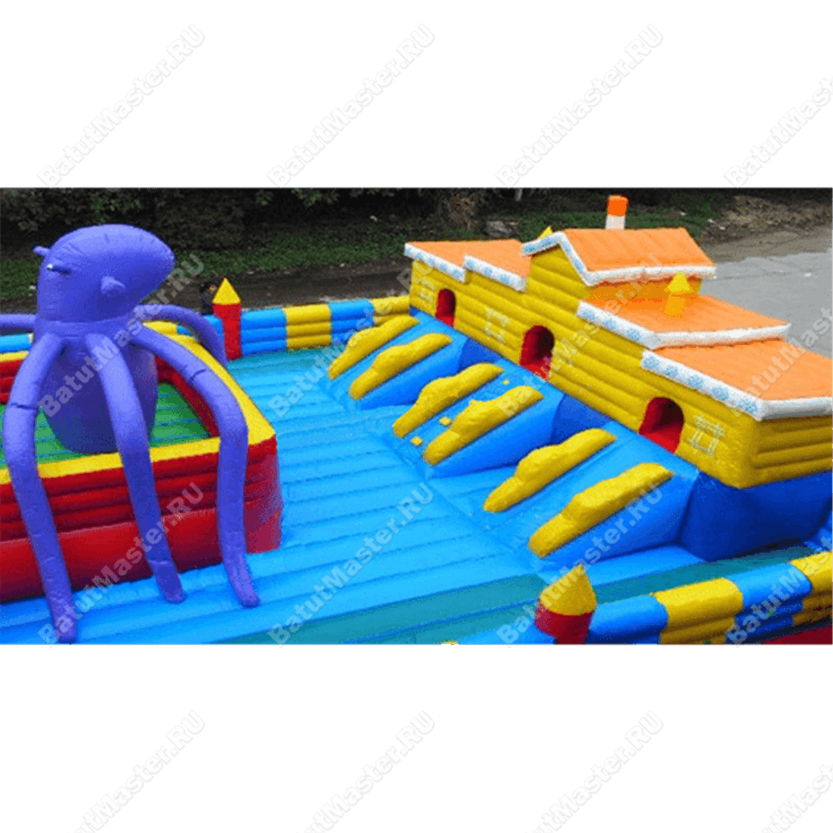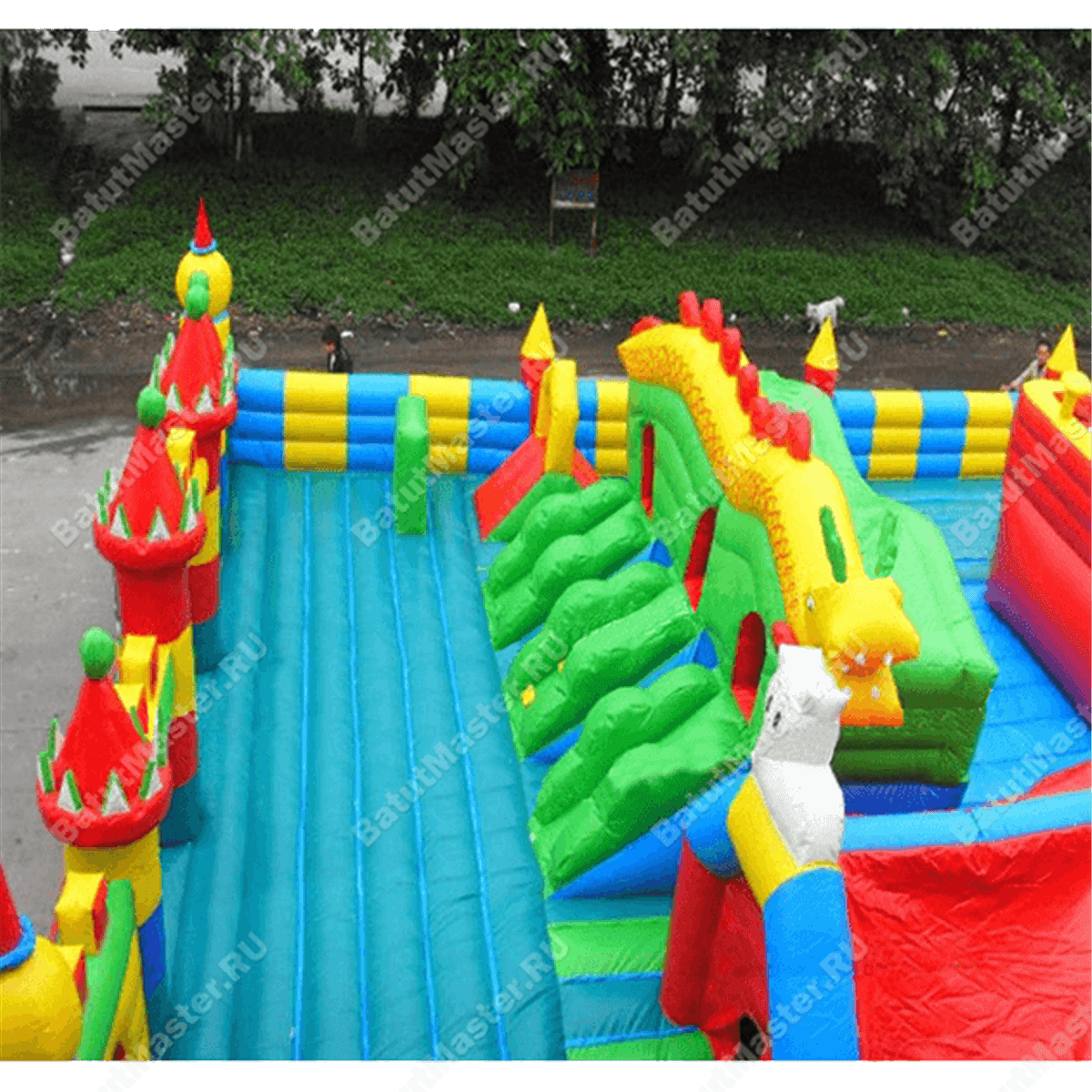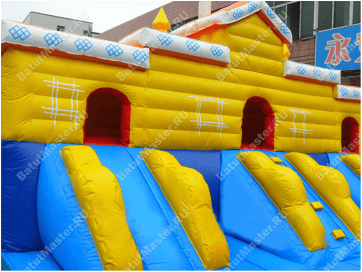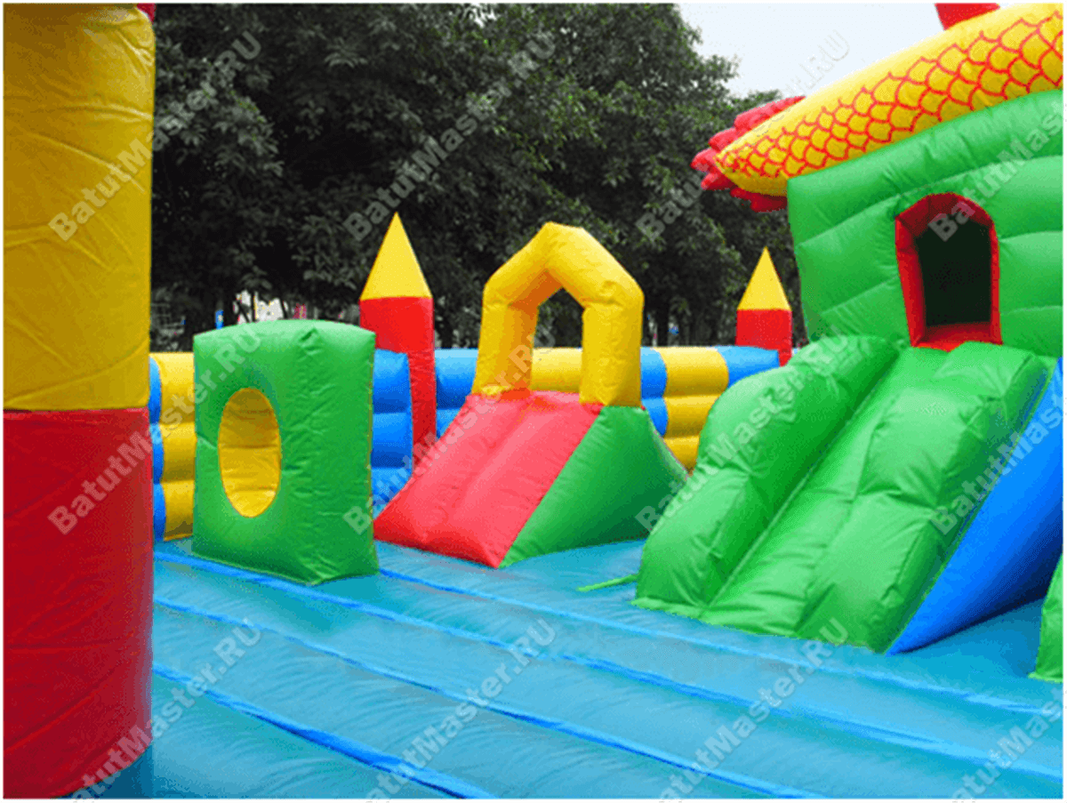 По всему периметру создано надувное ограждение с импровизированными остроконечными башнями. После того, как все горки и туннели будут пройдены, ребенка будут ждать домики «из бруса», взобравшись на которые, он весело сможет спуститься вниз. В центральной части аттракционы установлены еще одни подобные сооружения, но уже не желтым, а зеленым цветом. Из каждого домика выходит 3 спуска, но на площадке много и других развлечений, отдельно стоящих горок, иногда даже встречаются драконы.