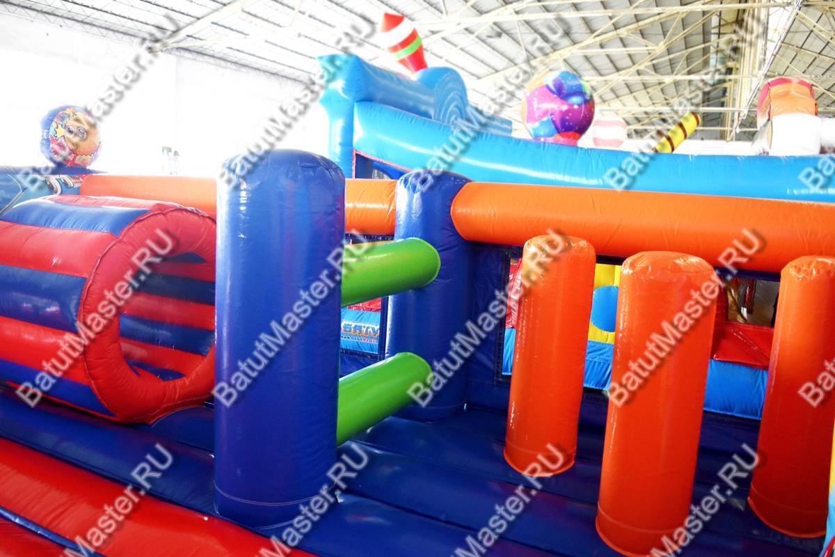 В левой зоне коммерческой площадки установлен надувной лаз, горизонтальные турники и вертикальные столбики. В этой части батут начинается подъем на высокую горку, которая по своей конструкции лестница/спуск сконструирована под прямым углом. Как только высота стартовой площадки будет взята, а это 2,5 м, ребенок сможет спуститься вниз по горке. Верх конструкции украшает милая фигура золотой рыбки.