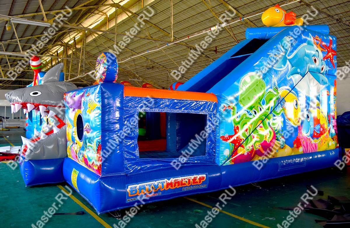 Данный надувной батут – яркое представление сказочной подводной жизни морских обитателей. В аттракционе можно встретить не только изображения рыб, осьминогов и других жителей моря, но и их надувные яркие фигуры. И начинается развлекательная площадка для бизнеса с огромной головы акулы, через открытую пасть которой дети могут попасть внутрь батута. Оставшаяся правая и левая зона фасадной стенки украшена яркими изображениями разноцветных рыб и иллюминаторами. Такие же точно рисунки можно встретить на задней стене батута, куда выходит внешняя сторона высокой горки. Функционально батут разделен на 3 части: основная площадка для прыжков и кувырков, левое пространство в виде небольшой полосы препятствий и задний правый угол – высокая горка. Боковые стены аттракциона полностью просматриваемые, поэтому они хорошо пропускают свет и дают циркулировать потокам воздуха.