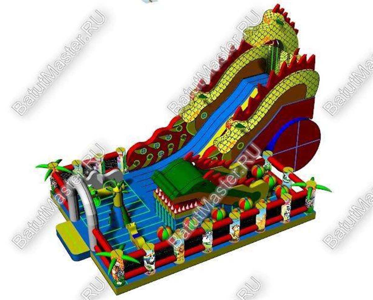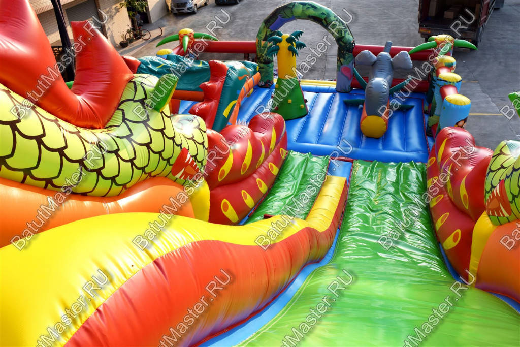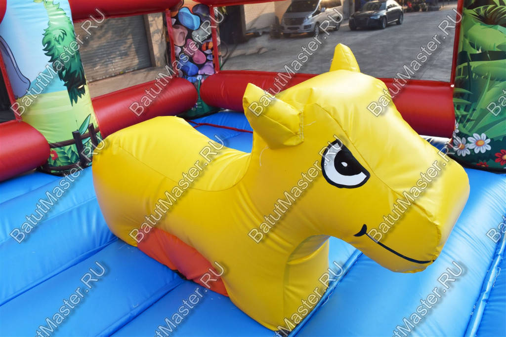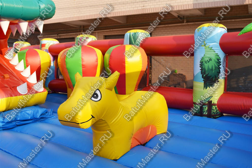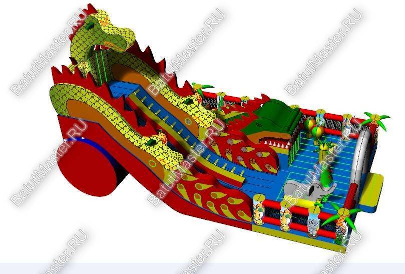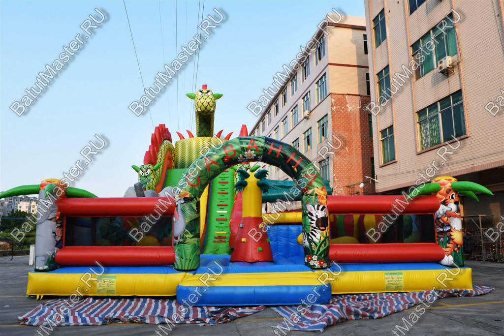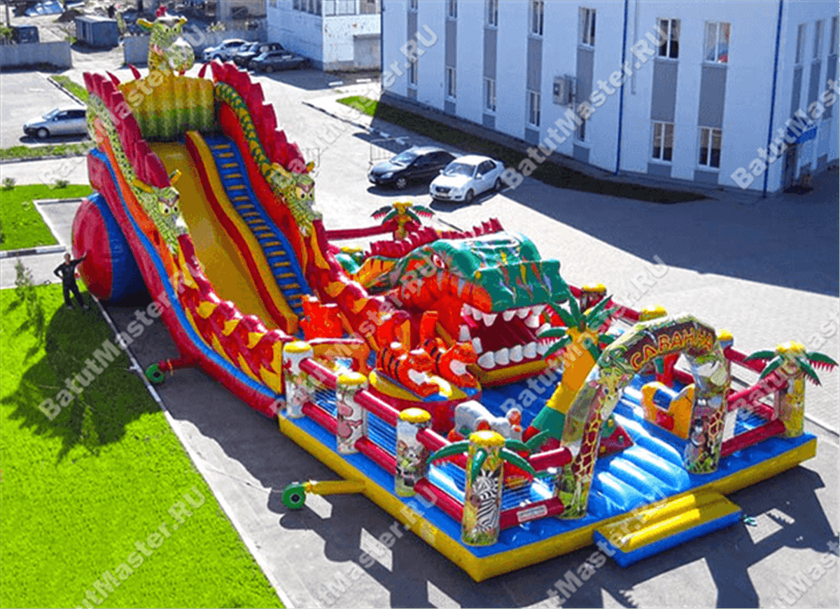 Надувной батут с размерами 17 на 10 м можно сразу охарактеризовать, как профессиональный, многофункциональный и выгодный. Благодаря своей огромной территории коммерческий аттракцион сумел вместить в себе самые увлекательные игровые элементы, которые приведут посетителей в восторг. Стиль выполнения - Африка, саванна, крокодилы. Поэтому начинается батут традиционно: с входа в виде арки, изображений жирафов и надувных пальм.