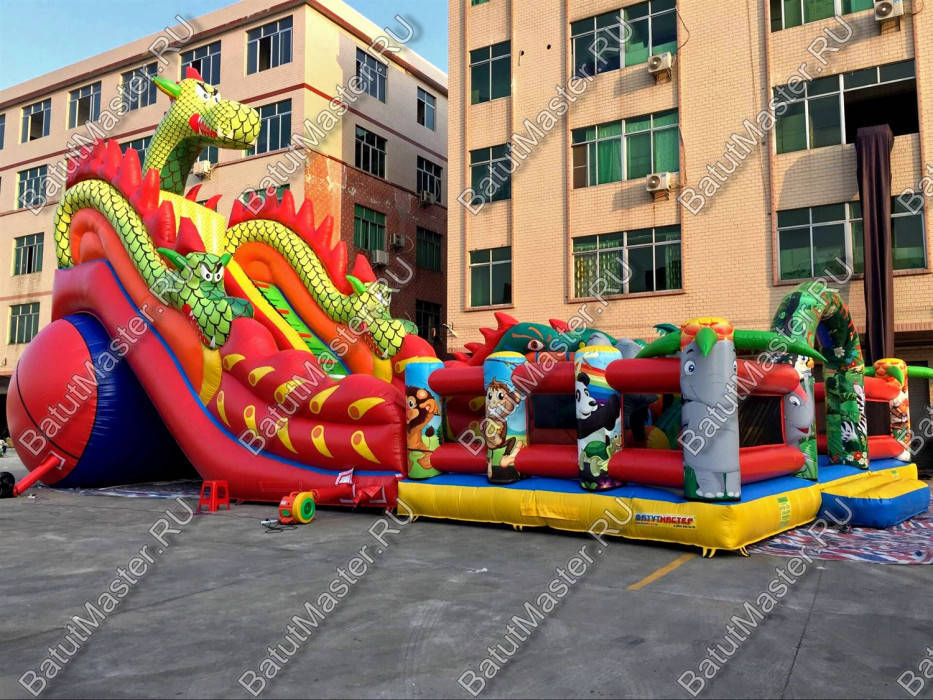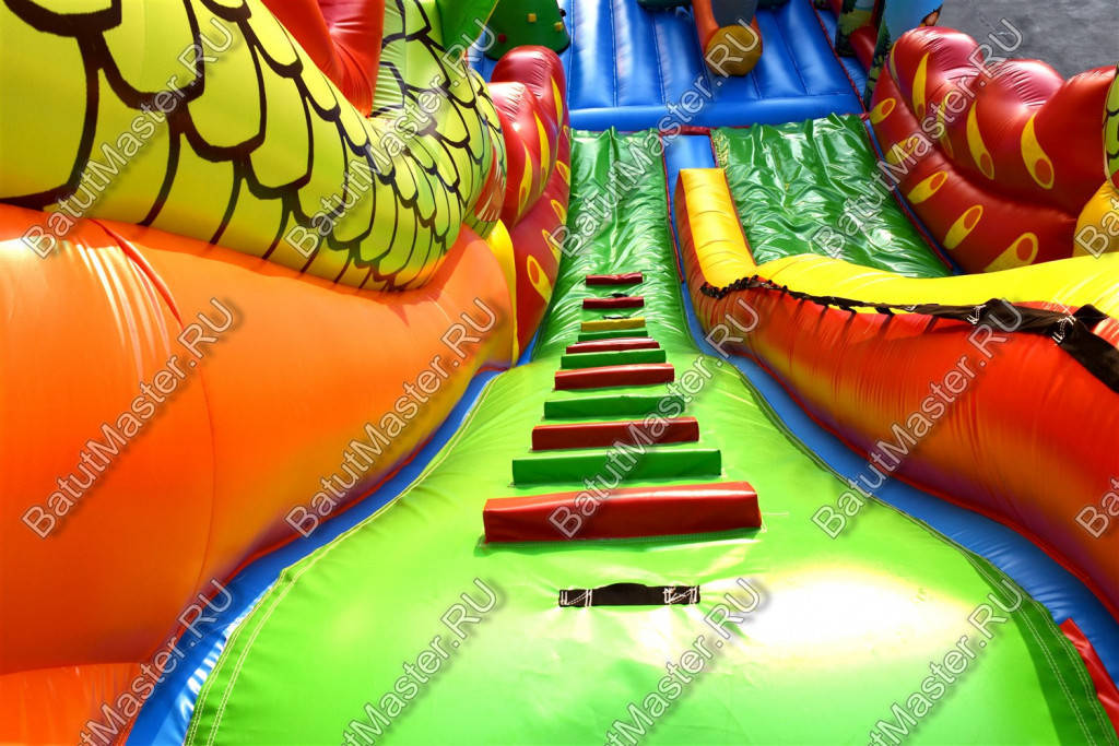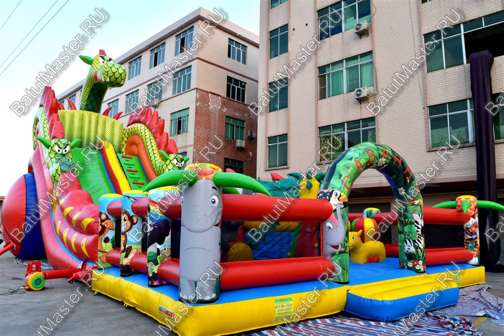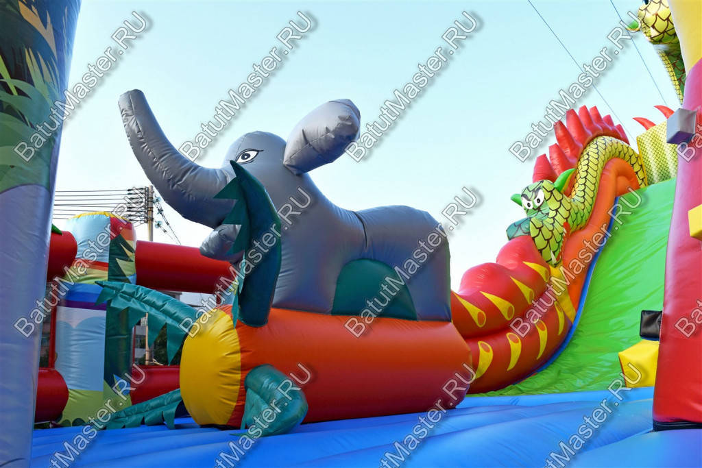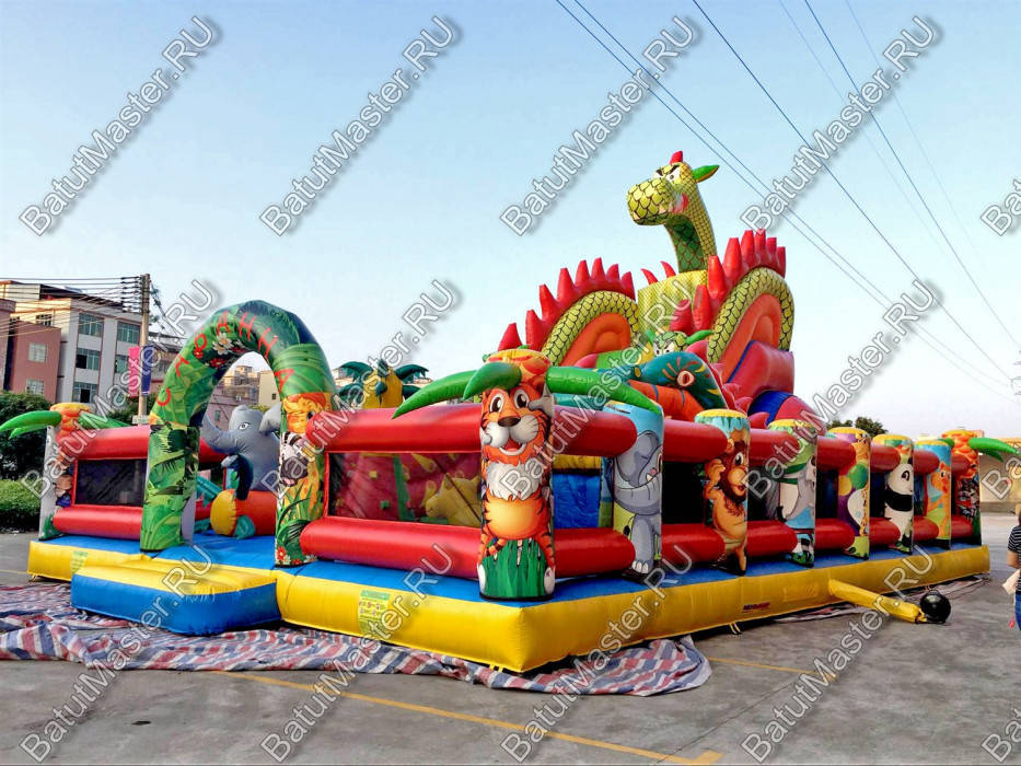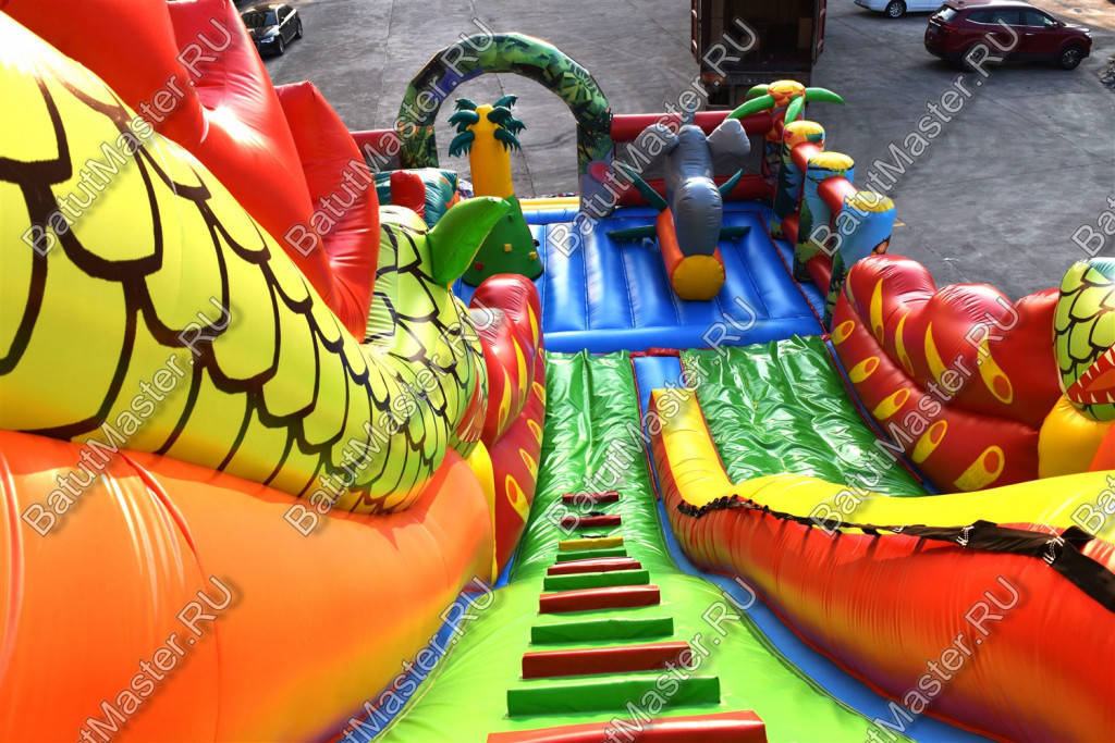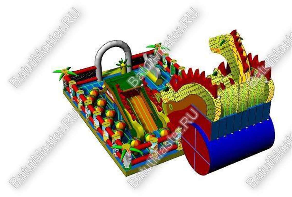 Надувной батут с размерами 17 на 10 м можно сразу охарактеризовать, как профессиональный, многофункциональный и выгодный. Благодаря своей огромной территории коммерческий аттракцион сумел вместить в себе самые увлекательные игровые элементы, которые приведут посетителей в восторг. Стиль выполнения - Африка, саванна, крокодилы. Поэтому начинается батут традиционно: с входа в виде арки, изображений жирафов и надувных пальм.