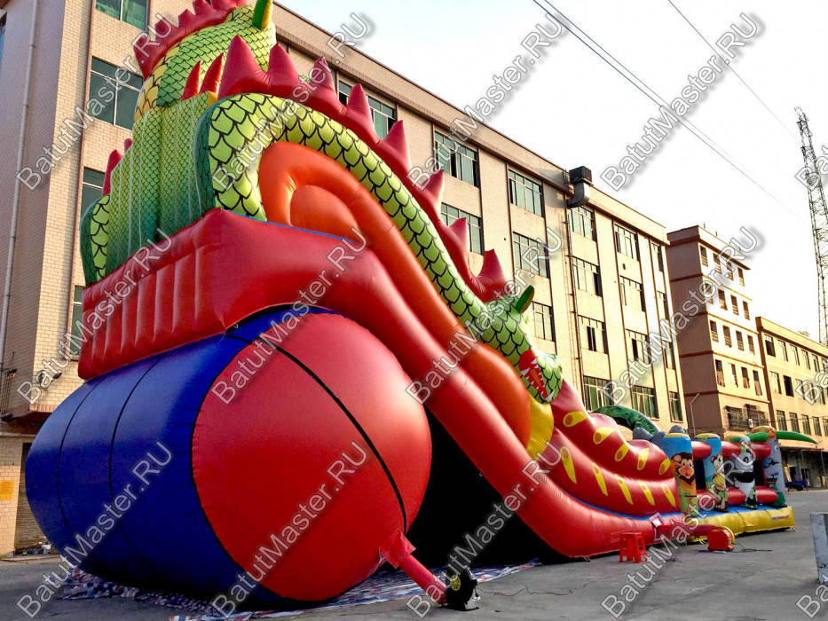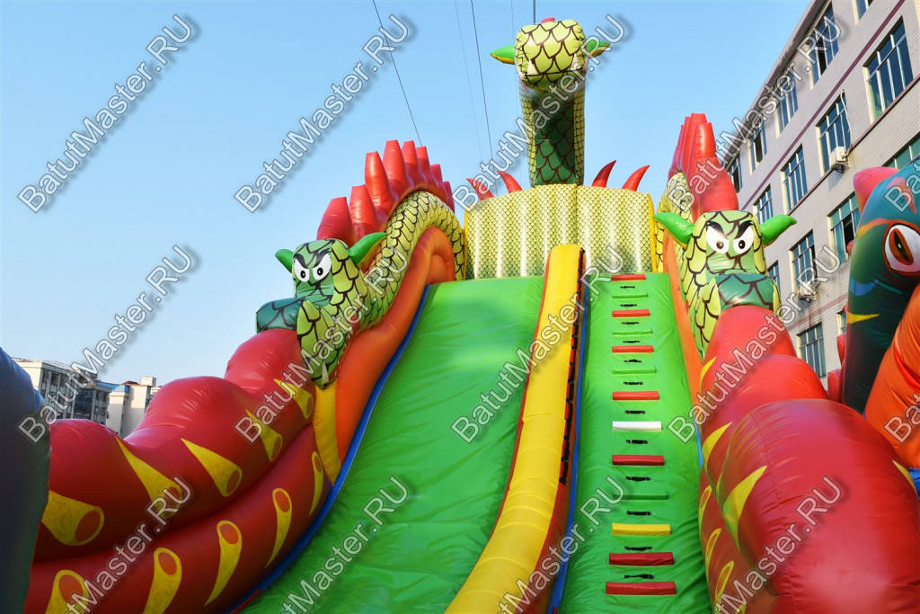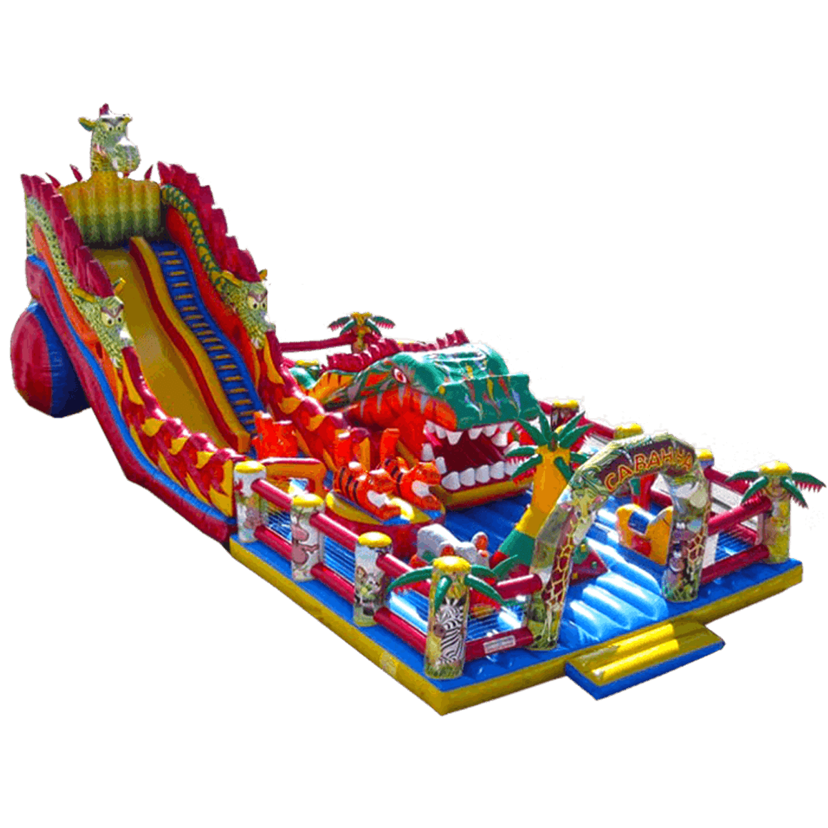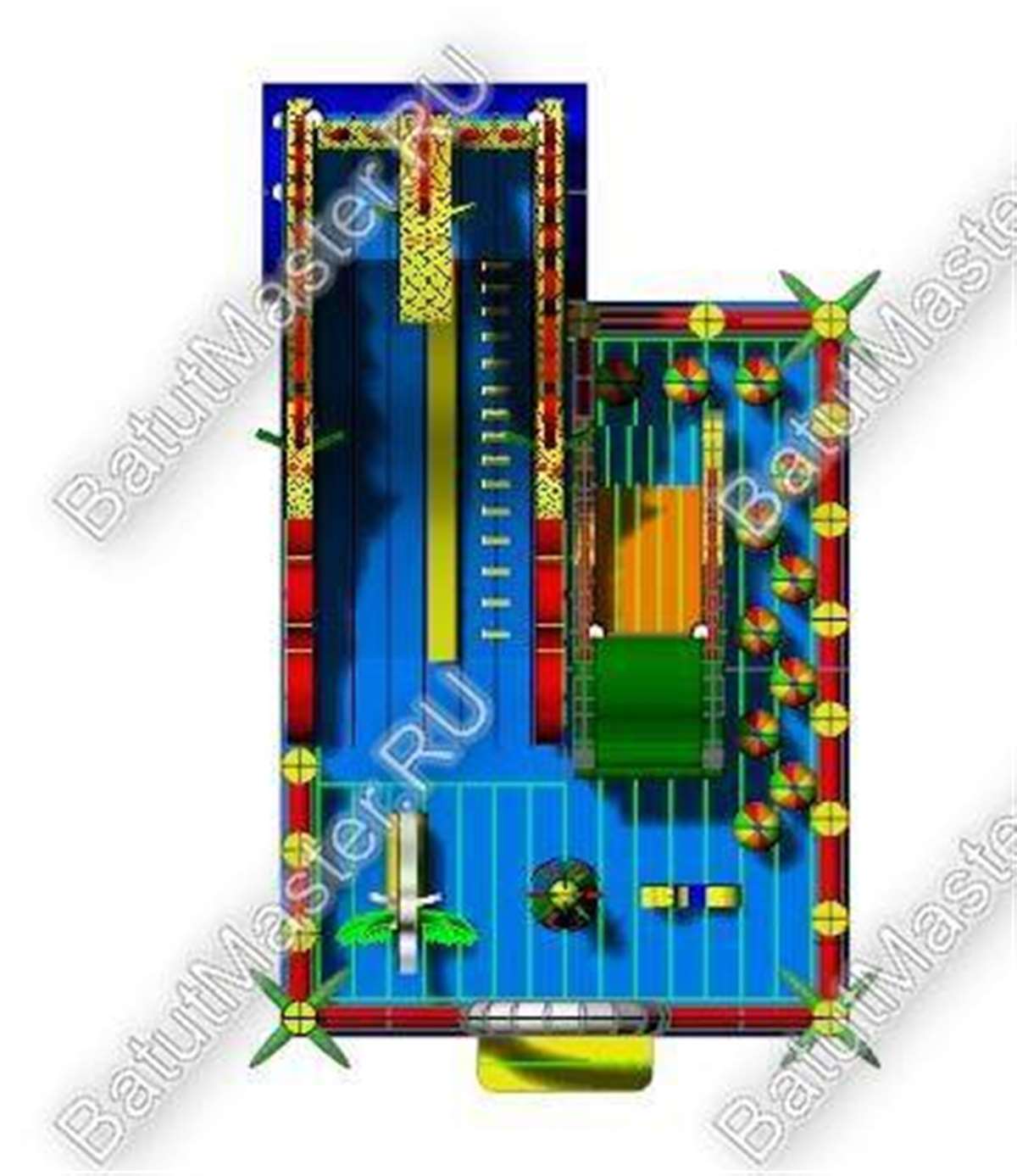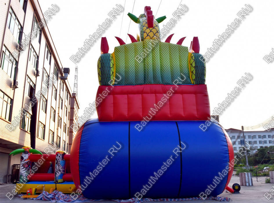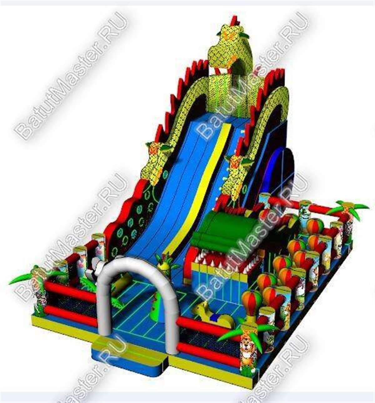 Надувной батут с размерами 17 на 10 м можно сразу охарактеризовать, как профессиональный, многофункциональный и выгодный. Благодаря своей огромной территории коммерческий аттракцион сумел вместить в себе самые увлекательные игровые элементы, которые приведут посетителей в восторг. Стиль выполнения - Африка, саванна, крокодилы. Поэтому начинается батут традиционно: с входа в виде арки, изображений жирафов и надувных пальм.