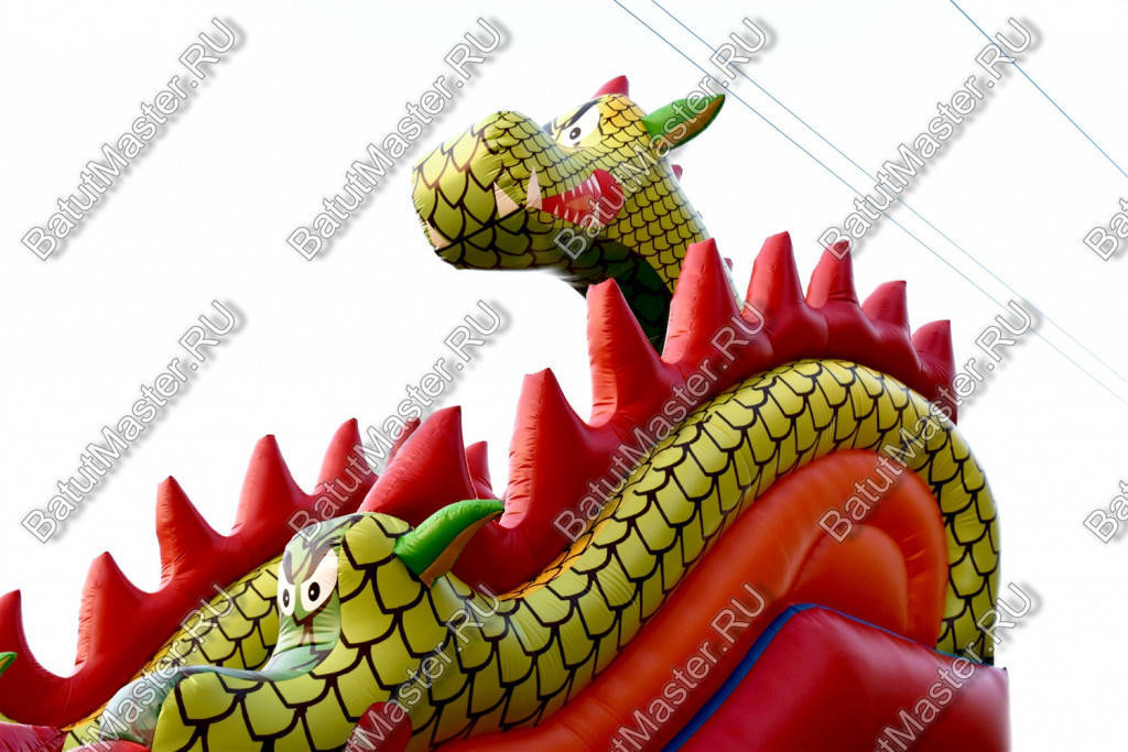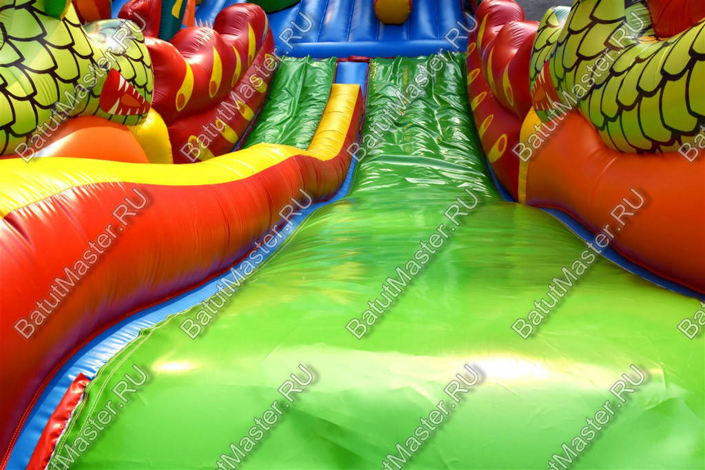 Вторая зона коммерческой площадки находится за прыгательной территорией справа – это робот-пасть в виде головы крокодила, которая продолжается к задней стенке батута горкой. Этот элемент достаточно пестрый, так как в нем сочетаются зеленый, оранжевый, желтый и красный цвета.