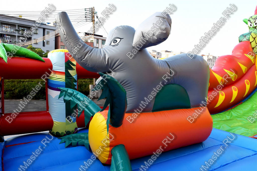 Первая зона аттракциона – это мягкая площадка для прыжков, на которой можно найти надувного слона, яркую пальму с нижним основанием в виде скалодрома, желтого бегемота и воздушные шары из разноцветных сегментов, расставленные по батуту до его самой задней части.