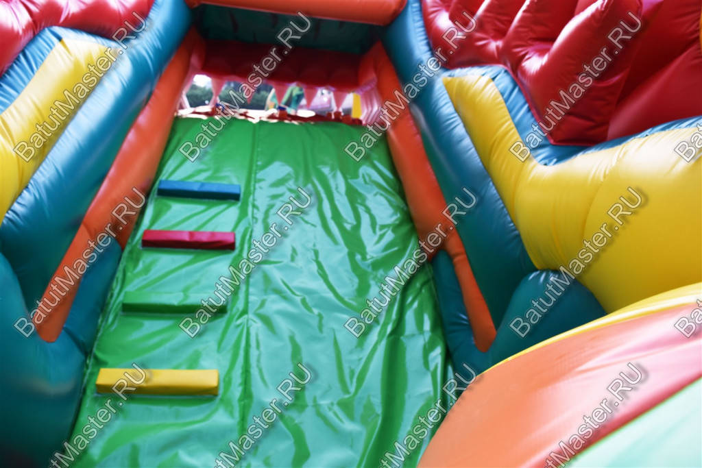 Третья зона батута для бизнеса – высокая горка (находится слева после прыгательной зоны), состоящая из двух частей: голубой лестницы и желтого склиза. Конструкция не ровная, а с небольшими изгибами, поэтому спускаться вниз будет куда увлекательней, чем с обычной! Высота стартовой площадки – 4 м.