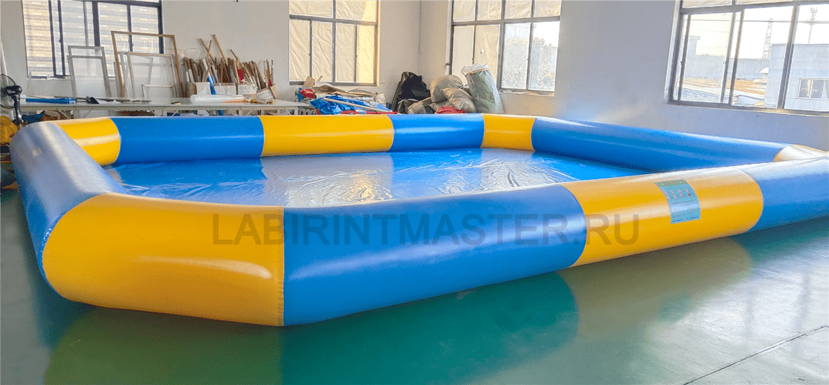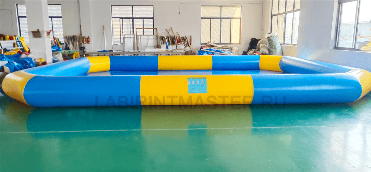 Надувной бассейн «Полосатик» 9*7*0.65 м — это яркий и многофункциональный аттракцион, который легко станет изюминкой любой детской зоны отдыха или развлекательного центра. Жёлто-голубой дизайн сразу привлекает внимание малышей и создаёт весёлую атмосферу праздника.