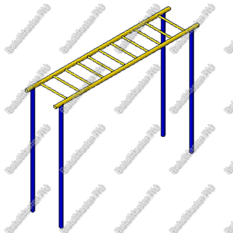 В основе конструкции этого рукохода четыре стойки, на которых закреплена горизонтальная лестница. Передвигаясь на руках в подвешенном состоянии, занимающийся развивает мускулатуру рук и гибкость опорно-двигательного аппарата. Для изготовления рукохода применяются оцинкованные профильные трубы. Чтобы исключить любые травмы, элементы Рукохода покрыты грунтовкой, а сверху защищены порошковыми красками от влияния атмосферных осадков. Прочность и надежность труб с толщиной стенки не менее 2 мм соответствует нормам и правилам строительства спортивного оборудования на открытых детских площадках.