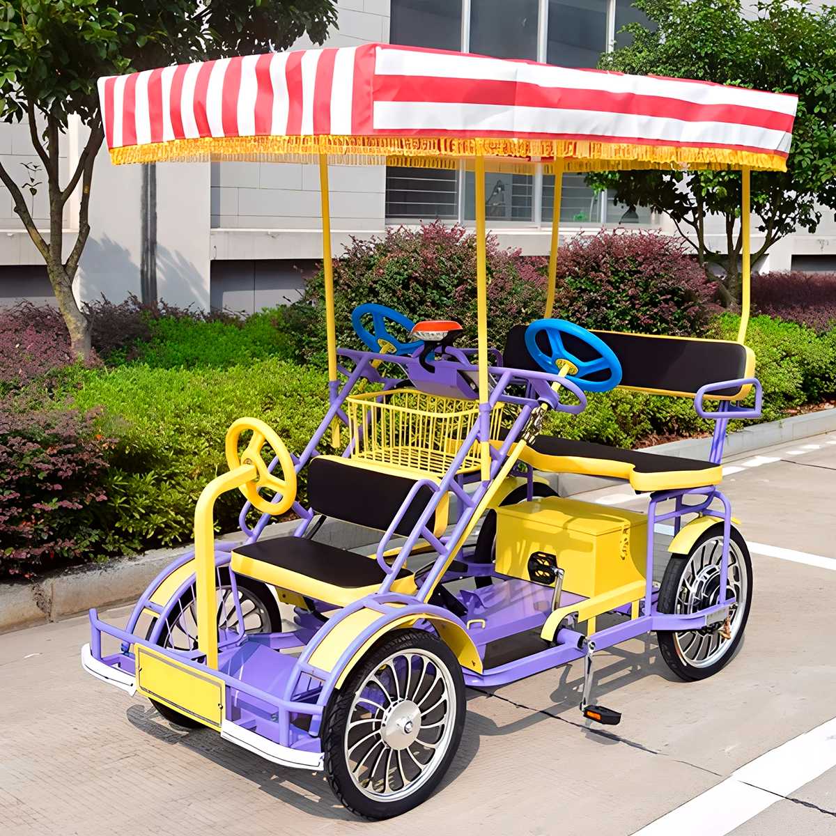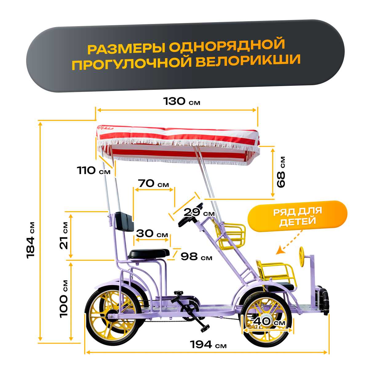 Этот веломобиль рассчитан на комфортную посадку и управление.Во время прогулки каждый из пассажиров получает возможность управлять семейным велосипедом при помощи руля. В движение он приводится двумя парами педалей расположенными у мест для взрослых. Два удобных сиденья расположены на оптимальной высоте, обеспечивая удобную посадку и комфорт во время движения.Внизу на уровне ног находятся педали приводящие велосипед в движение. Перед каждым посадочным местом расположен руль управления. Небольшое движение рулевого колеса заставляет поворачивать передние колеса. Для удобства водителей предусмотрены два руля, каждый из которых обтянут нескользящим покрытием, обеспечивающим надежный захват. Двойное управление добавляет интерактивности процессу катания, делая его интересным для семейных поездок. Крутить педали могут оба пассажира, что делает движение более равномерным и снижает нагрузку на одного участника поездки. Веломобиль оснащен надежным тормозным механизмом, позволяющим быстро остановиться в любой момент.Также велосипед обятнут тентом обеспечивающий защиту от палящего солнца, дождя и других погодных условий.