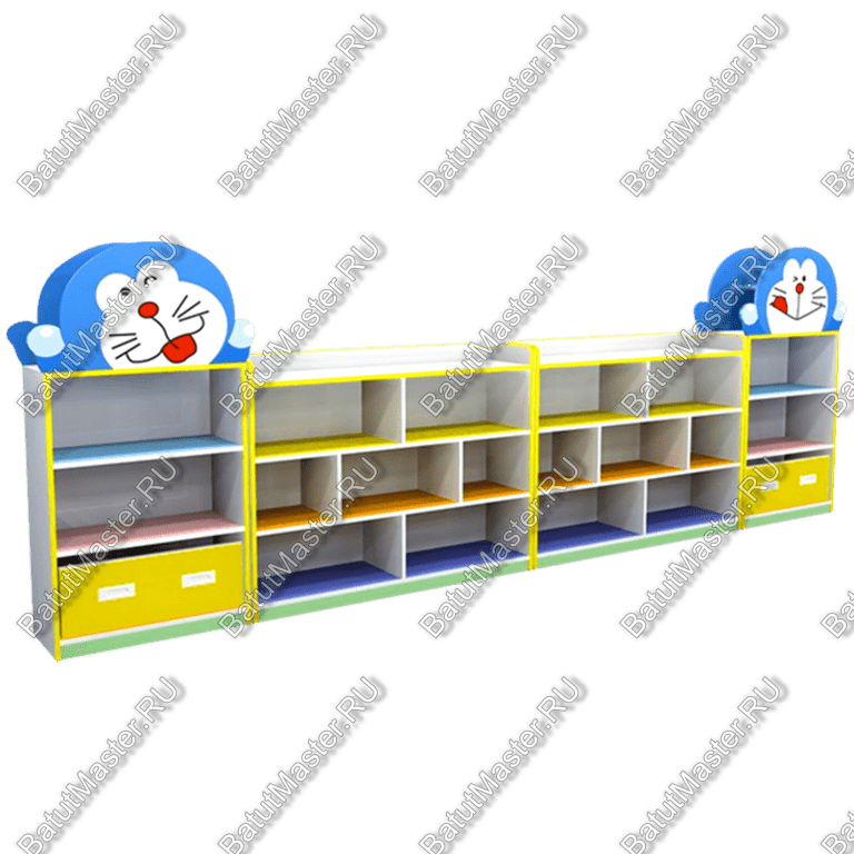 Конструкцию шкафа одновременно можно назвать простой и функциональной. Весь шкаф состоит из двух половин, которые идентичны друг другу. В состав каждой входит один шкафчик из двух горизонтальных полочек с двумя выдвижными ящиками в нижней части. Рядом располагаются 3 горизонтальные полки, которые имеют по 4 горизонтальные полки, разделенные вертикальными стенками на ячейки. Средняя полка состоит из 3 ячеек разной ширины. На крайних шкафчиках расположены стилизованные фигурки котят.
