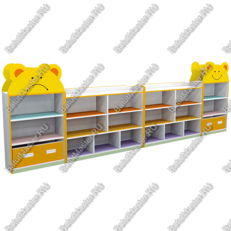 Стилизация под медведя всегда вызывает у детей доверие. Модель изготовлена по принципу вместить в себя все наиболее нужные игрушки, в том числе и мелкие для размещения их в выдвижных ящиках. Весь шкаф разделен на две симметричные конструкции, которые разделены вертикальной стенкой. Каждая половина имеет по три секции, в которых расположено две верхних вертикальных полки и три нижних ячейки. Шкаф имеет длину 3600 мм. Чтобы установить такой шкаф в группе детского сада необходимо правильно подобрать место. Пол должен быть ровный, а корпус шкафа не должен выступать в дверных проемах.